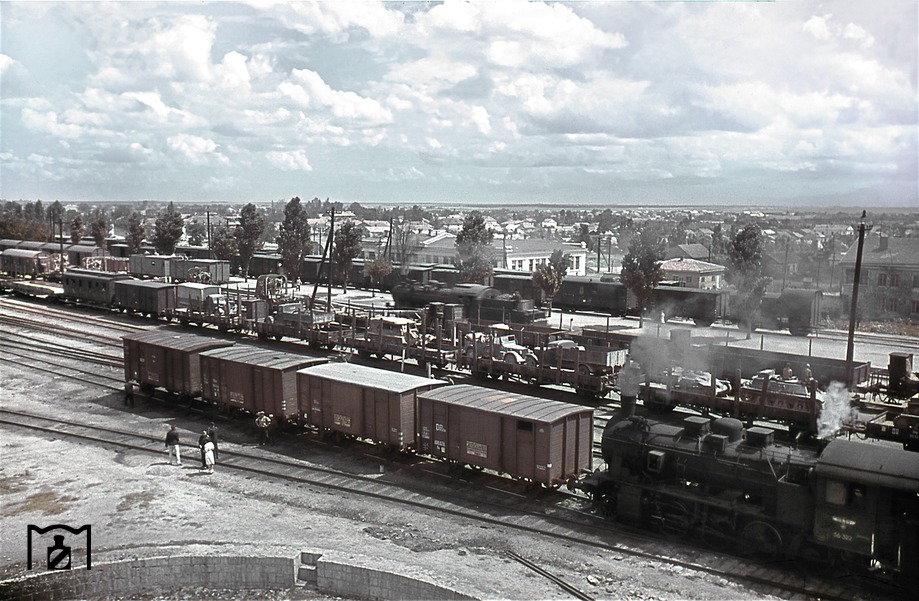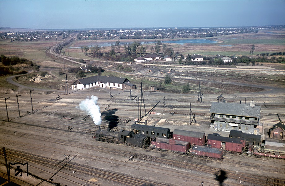 13. Станция Бобринская на перегоне Знаменка - Черкассы: Вид с мачты освещения на северный выезд сортировочной станции Бобринская (на полпути между Знаменокй и Черкассами). На маневровой работе pr. G 7.1 (Тип 55.0). (05.1943)