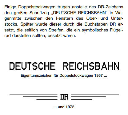В книге "Anstrich und Bezeichnung Trieb- und reisezugwagen" (стр.162) пишут, что изначально на двухэтажках была надпись DEUTSCHE REICHBAHN, а с 1972 уже DR