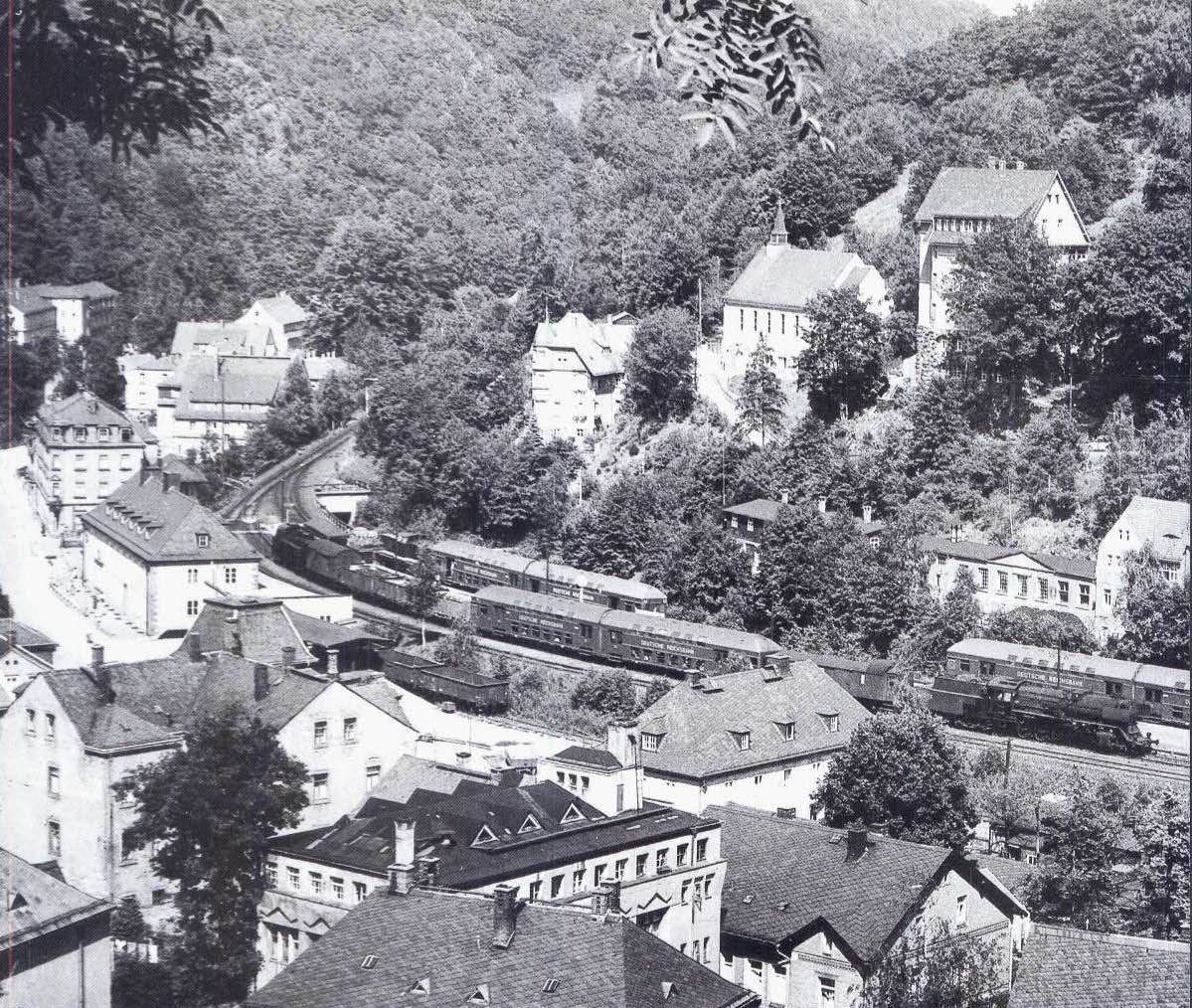 …Röditzburg. Nicht weit von diesem Aufnahmestanpunkt entfernt ist ebenfalls im Sommer 1968 die 93 622 mit einer interessanten Doppelstockwagengarnitur unterwegs.