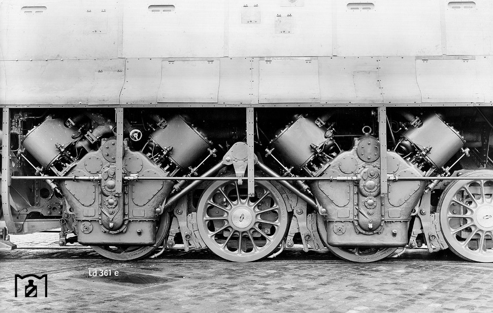 Четыре V-обр. паровые машины, по одной на каждую ось (на 2-ю и 4-ю справа и 1-ю и 3-ю слева). Дышел нет, ПРМ клапанный, все сбалансировано, машины на подрессоренной раме, привод на оси через муфты http://memim.com/drb-class-19.10.html
