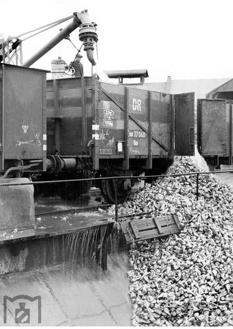 Разгрузка и одновременно промывка сахарной свеклы сильной струей воды,1940й год.