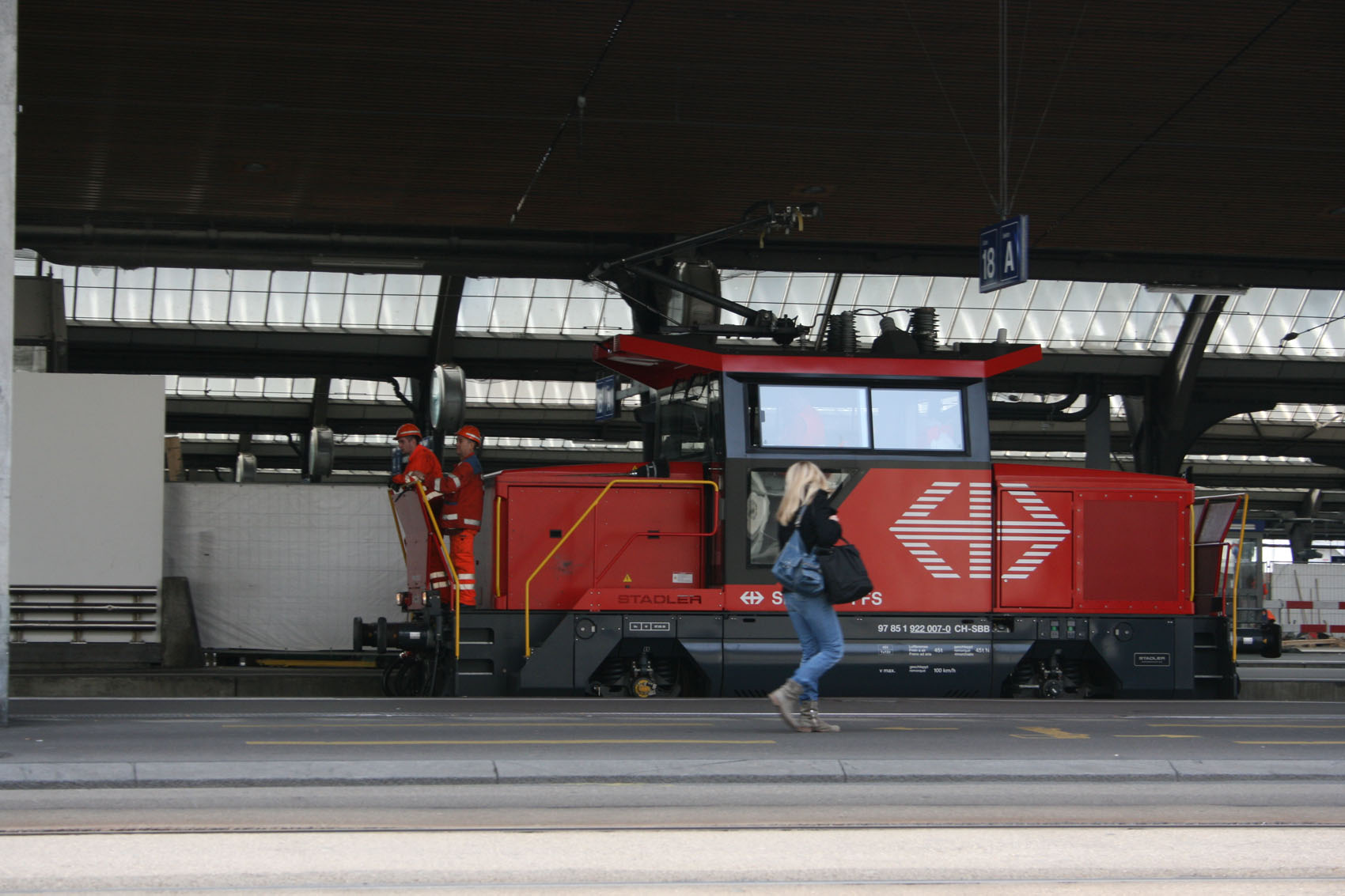 Ee 922 фирмы Stadler довольно распространенный маневровый электровоз Швейцарии. Для нас это немного необычно. И надо же было влезть этой даме в кадр!
