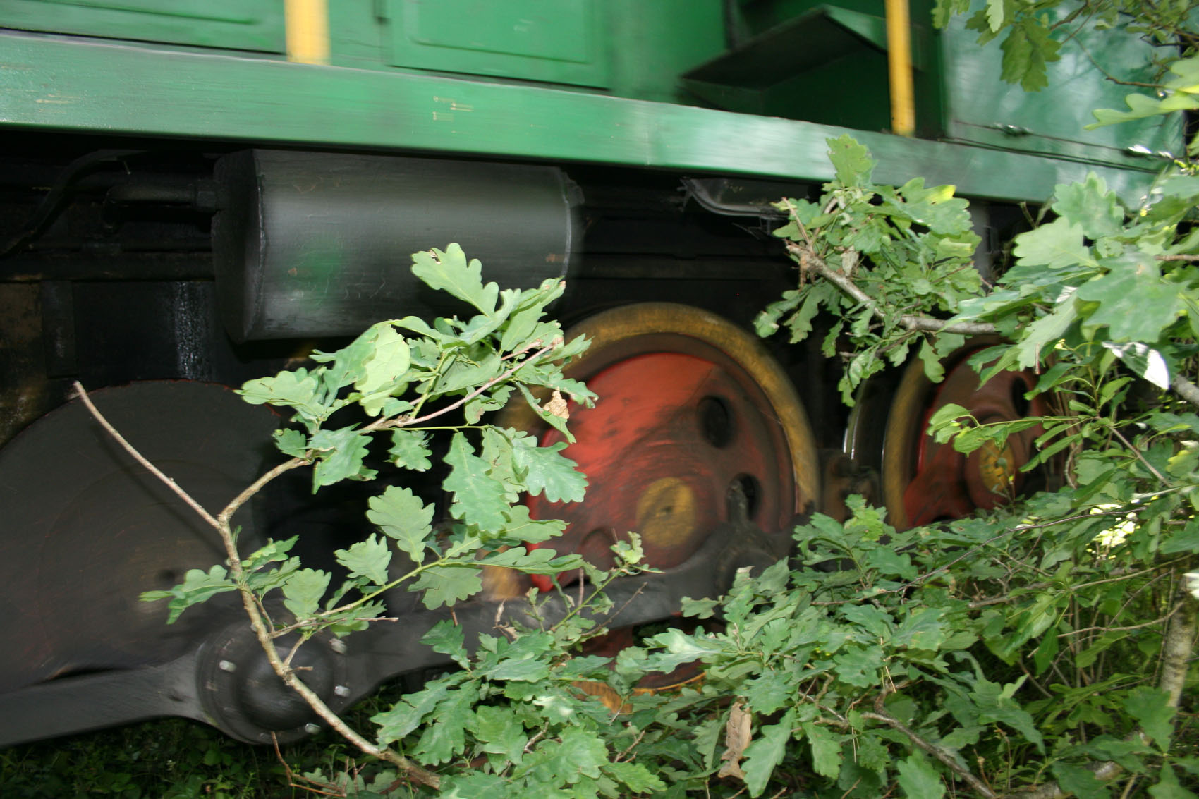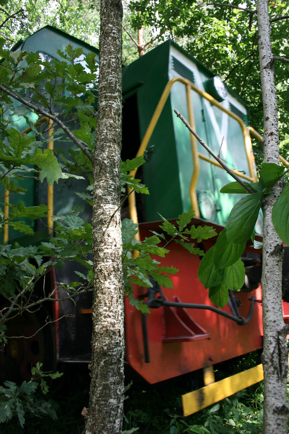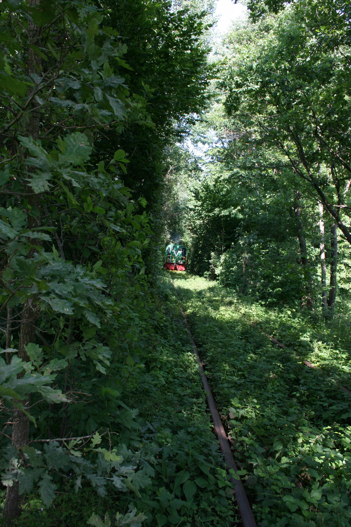 От самой станции в Оржевский ДОК протянута однопутная ветка через лес и болото, местами концы шпал почти нависают над комариным заповедником, это важно, поймете почему. Ну, пошел я весь такой из себя в белых джинсах, ведь в "Тоннель любви" иду, а не в мазутные бурьяны! Это я так первые метров триста думал... Собственно, тоннель образовался в результате "прочухивания" габарита составом, изредка курсирующим между станцией и ДОКом, в некоторых местах он напоминал мне габаритные схемы в книге. Ходит состав нечасто, увидеть его большая удача, как мне казалось. Шел я, щелкал фотоаппаратом, так как каждый десяток метров неповторим и все казалось, что вот там, дальше, будет вообще потрясающий вид. Пройдя таким образом около двух километров по грязным, залитым мазутом, междушпальным бурьянам, я попал в место, заключенное с обеих сторон в заболоченный питомник голодных комарищ. Вскоре на оборону от кровососов уходило времени больше, чем на прогулку и фотографирование. Белые некогда джинсы превратились в нечто жуткое, про обувь вообще молчу. И о, чудо - в тоннеле зазеленел тепловозик! Обрадовавшись выпавшей удаче, я быстро пришел в себя - справа и слева было не более полуметра, а состав надвигался... Пришлось срочно фиксироваться за какую-то березку, положение было такое шаткое, что сбоку получились крайне неудачные кадры. Проехав мимо, тепловозик и пара вагонов... внезапно остановились и простояли целую вечность! Комаров помните? Я тоже. Это повторилось раза четыре, идти до ДОКа как-то уже перехотелось, пора было на электричку, а путь был отрезан. Залезть на вагон было не вариант, так как стоя на лестнице, нужно было держаться, одна рука была занята вещами и фотоаппаратом, другая - веткой для отмахивания от комаров, третья еще не выросла. Вот так с остановками мы и двигались в направлении станции, зачем они были нужны в безлюдной болотистой местности - "тайна сия велика есть".