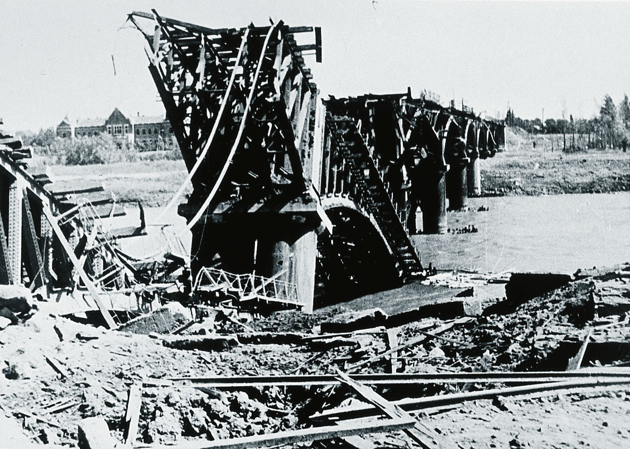 К концу 1945-го мост был временно отремонтирован и движение по нему возобновилось. Однако сильное наводнение 1946 года смыло временные конструкции и в 1947-м году начались работы по полному демонтажу моста. Последний поезд прошел по нему 6-го декабря 1946-го года.