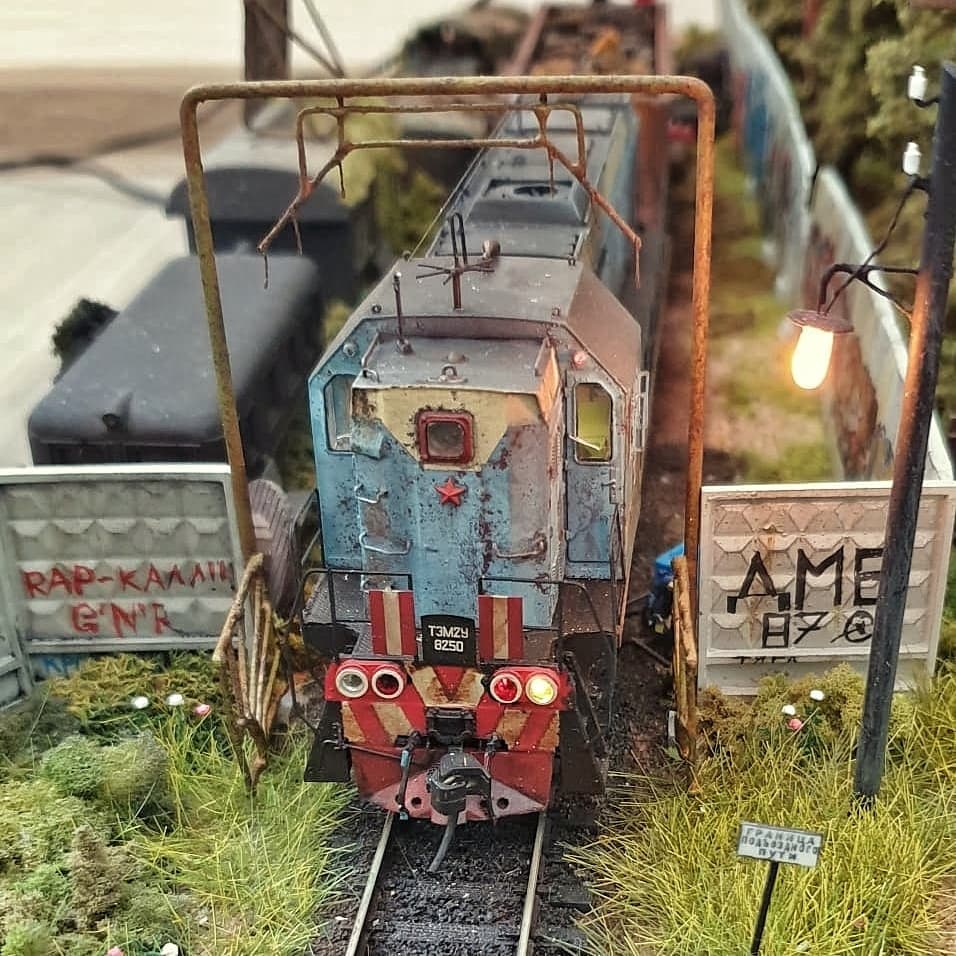 Ещё несколько художественных фото модели тепловоза ТЭМ2У-8250 со следами эксплуатации. Автор модели московский моделист Владимир Попов. Фото сделаны на домашнем макете Максима Баранова.