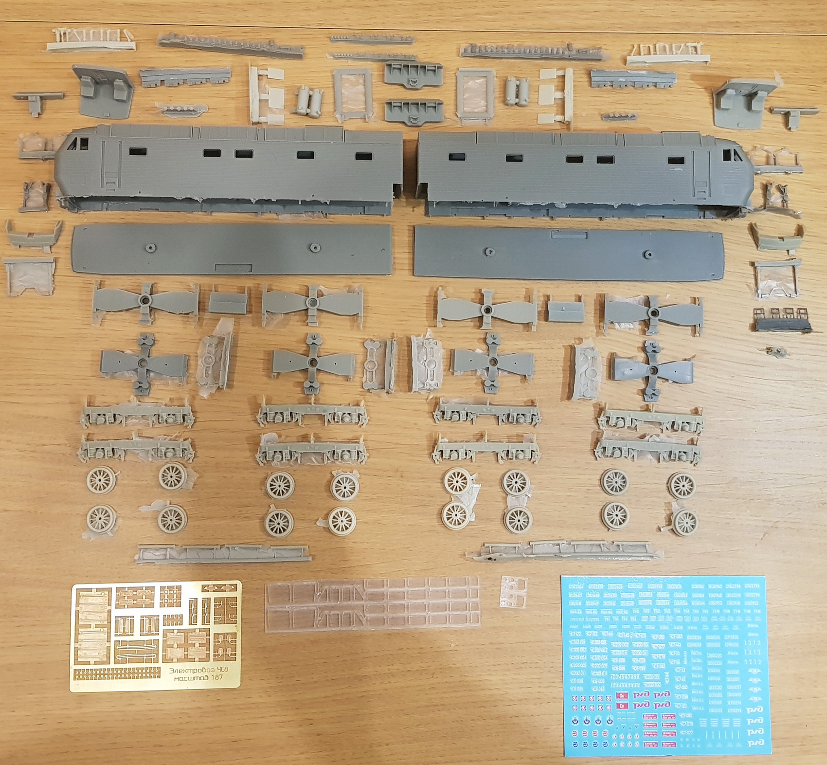 В набор входит полный комплект смоляных деталей для сборки стендовой модели электровоза ЧС-033-082, включая всю мелочевку, набор травленых деталей, комплект фрезерованных стекол и набор декалей с разными номерами. Стойки изоляторов рассчитаны под установку пантографов от Дмитрия Анютина (Светтофор). Важный момент: у электровоза ЧС8 межосевое в тележке 2950мм (в масштабе НО 33,9мм) А у электровозов ЧС6, ЧС7 и ЧС200 - 3200мм (36,8мм). Для простоты обмоторивания у модели локомотива ЧС8 стоят телеги идентичные ЧС7 и ЧС6 с ЧС200. Доноры подходят те же.