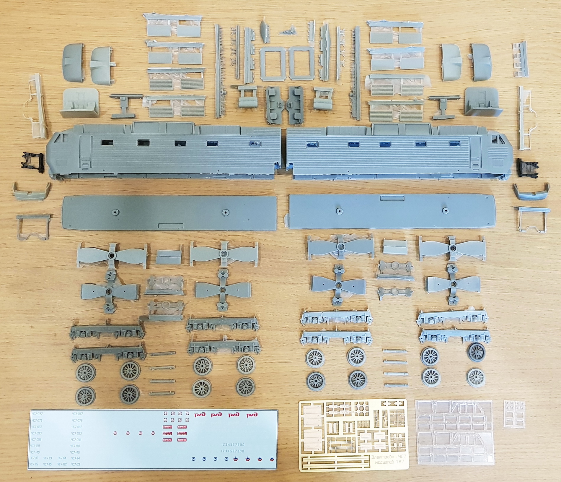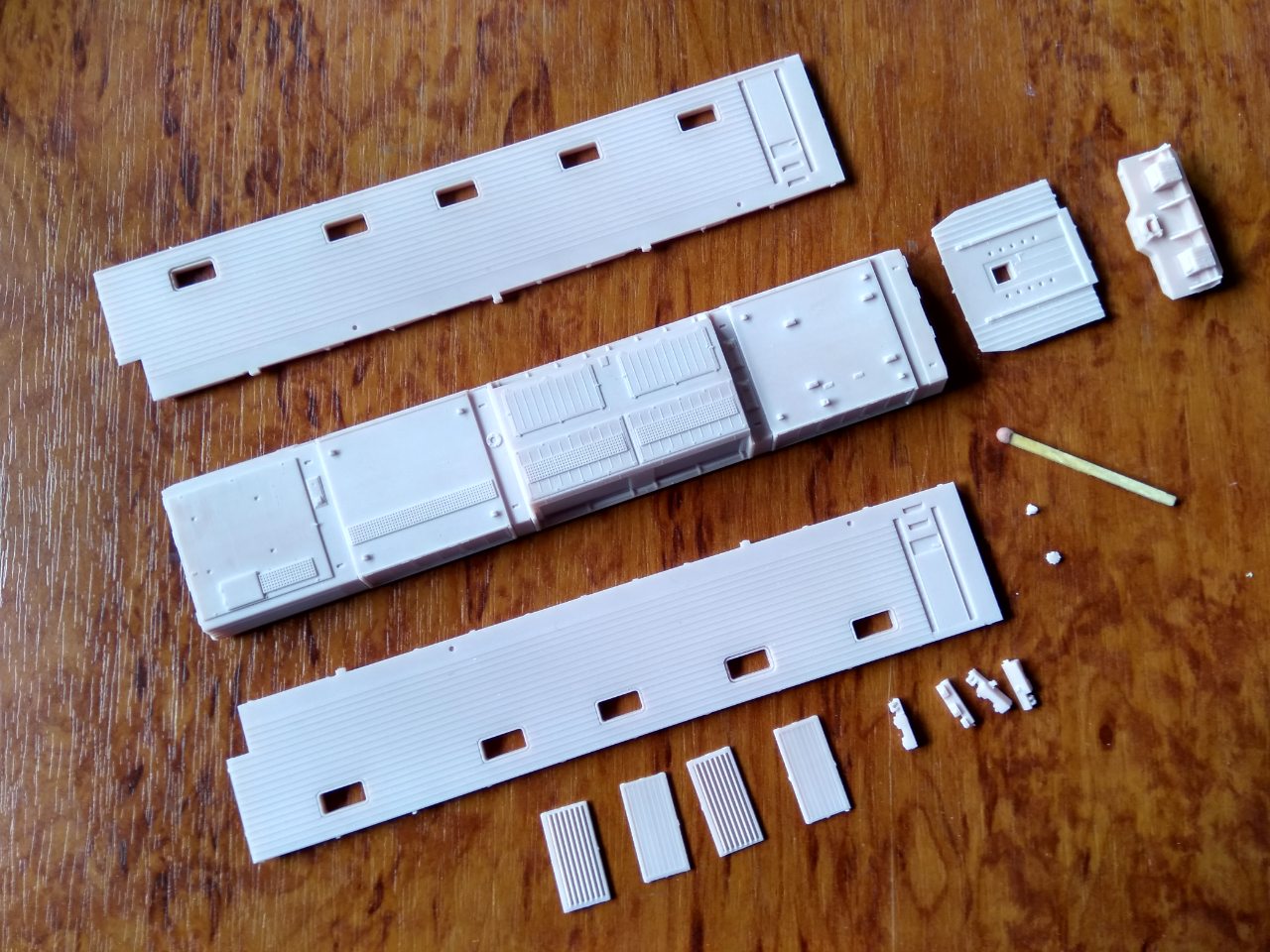 В набор входит полный комплект смоляных деталей для сборки стендовой модели, включая всю мелочевку, набор травленых деталей, комплект фрезерованных стекол и набор декалей с разными номерами. Стойки изоляторов на крыше рассчитаны под установку пантографов от Дмитрия Анютина (Светтофор). Изготовлением ходовок под эту модель занимается Александр Локшин.