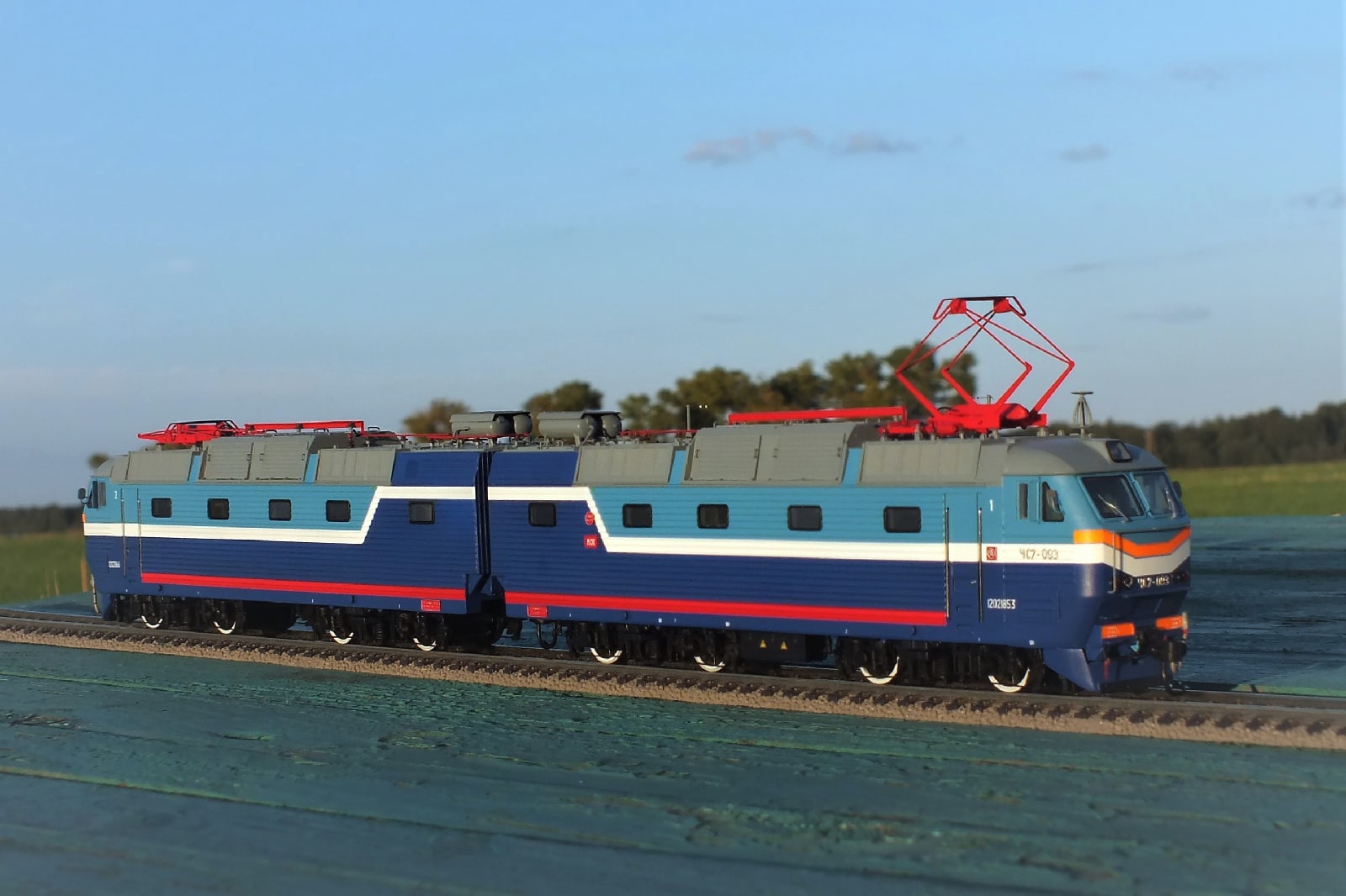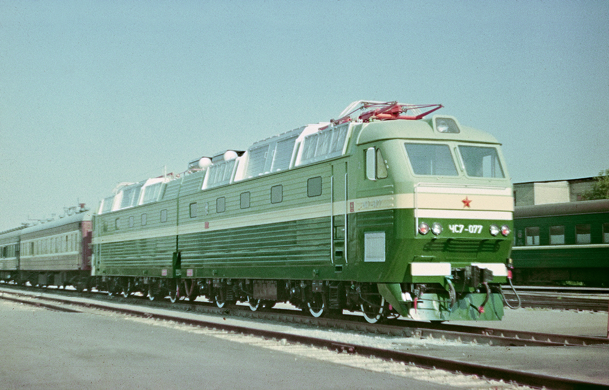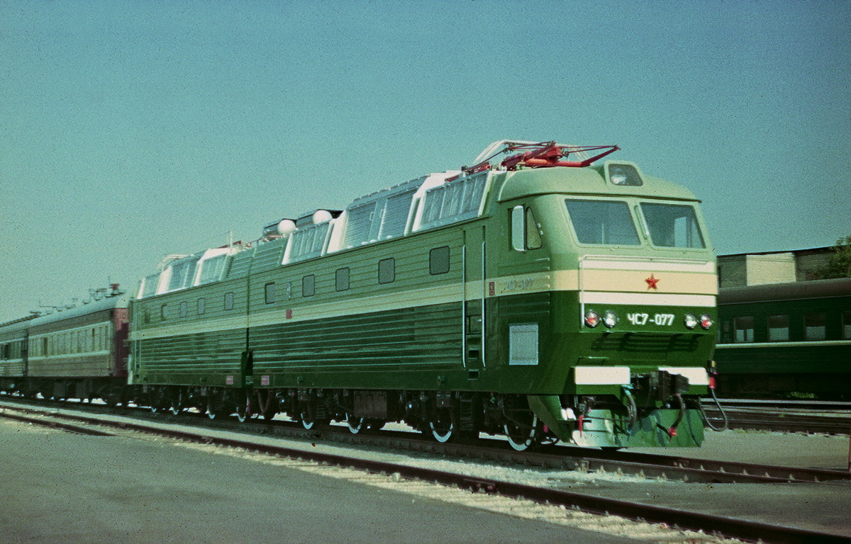 Электровоз ЧС7-077, депо Москва-III. Построен заводом Шкода в городе Пльзень в 1986 году. Модель выполнена в околозаводской окраске. Прототип в 1986 году проходил динамико-прочностные испытания экипажной части на кольце ВНИИЖТ в Щербинке.