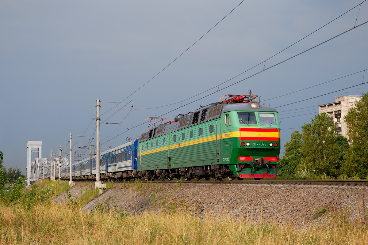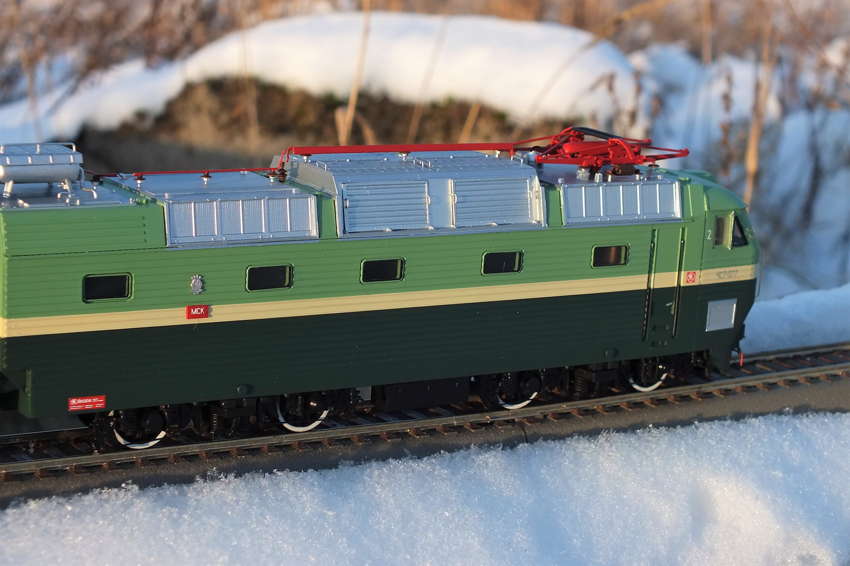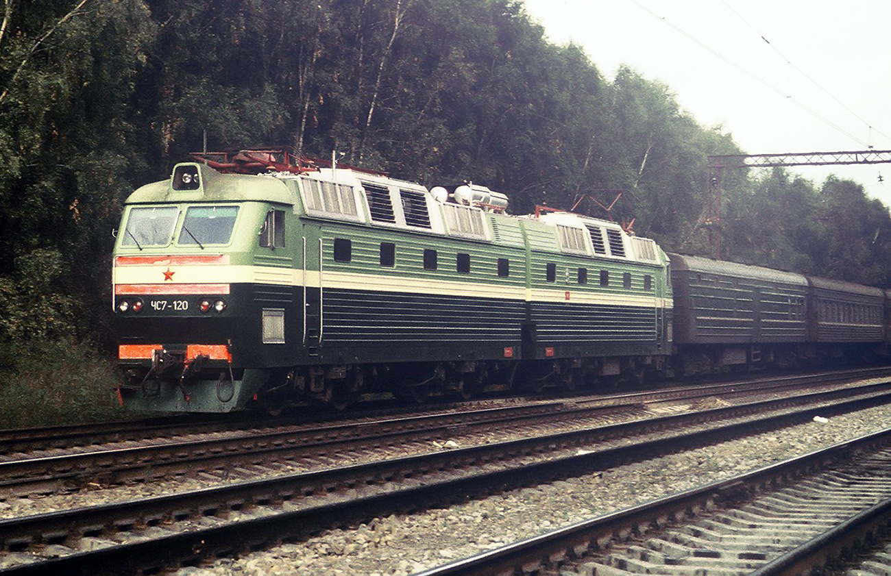 Электровоз ЧС7-077, депо Москва-III. Построен заводом Шкода в городе Пльзень в 1986 году. Модель выполнена в околозаводской окраске. Прототип в 1986 году проходил динамико-прочностные испытания экипажной части на кольце ВНИИЖТ в Щербинке.
