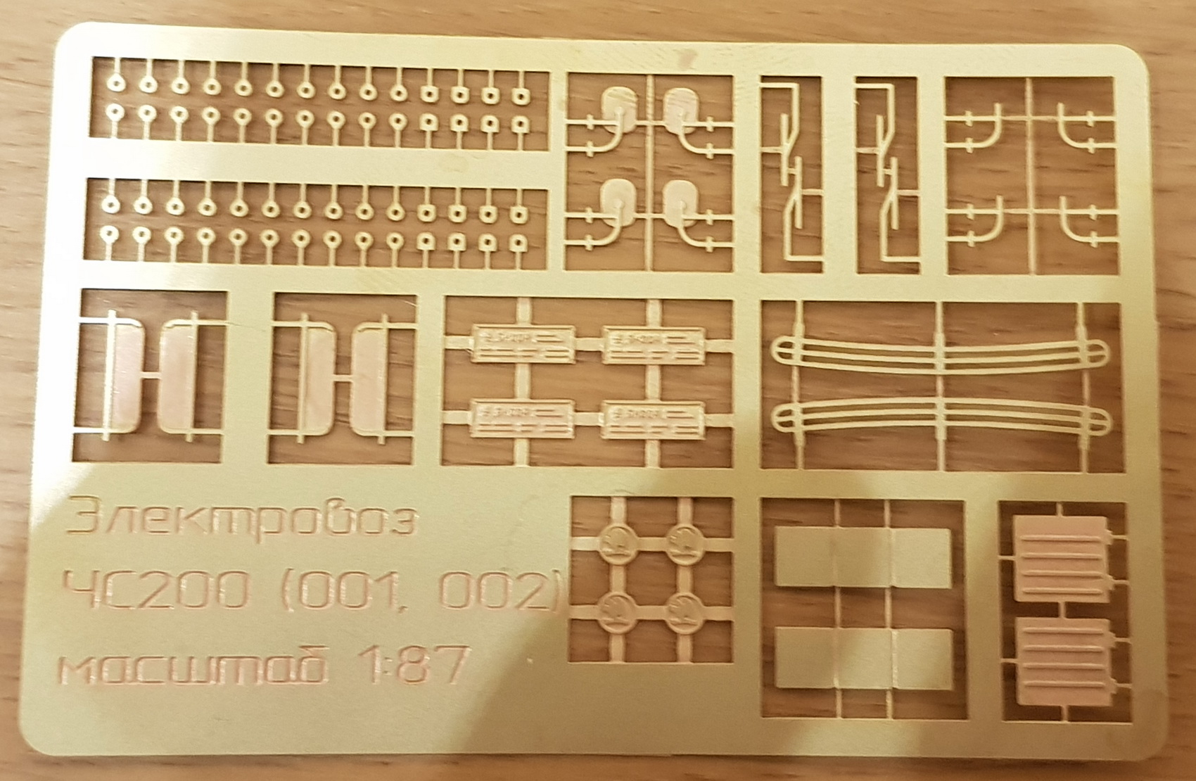В набор входит полный комплект смоляных деталей для сборки стендовой модели электровоза ЧС200-001 или ЧС200-002, включая всю мелочевку, набор травленых деталей, комплект фрезерованных стекол и набор декалей с разными номерами. Поскольку машины были опытные то на них в разное время стояли разные типы пантографов. Так как посадочные размеры у пантографов отличаются-то все изоляторы клеятся отдельно под нужный тип пантографа.