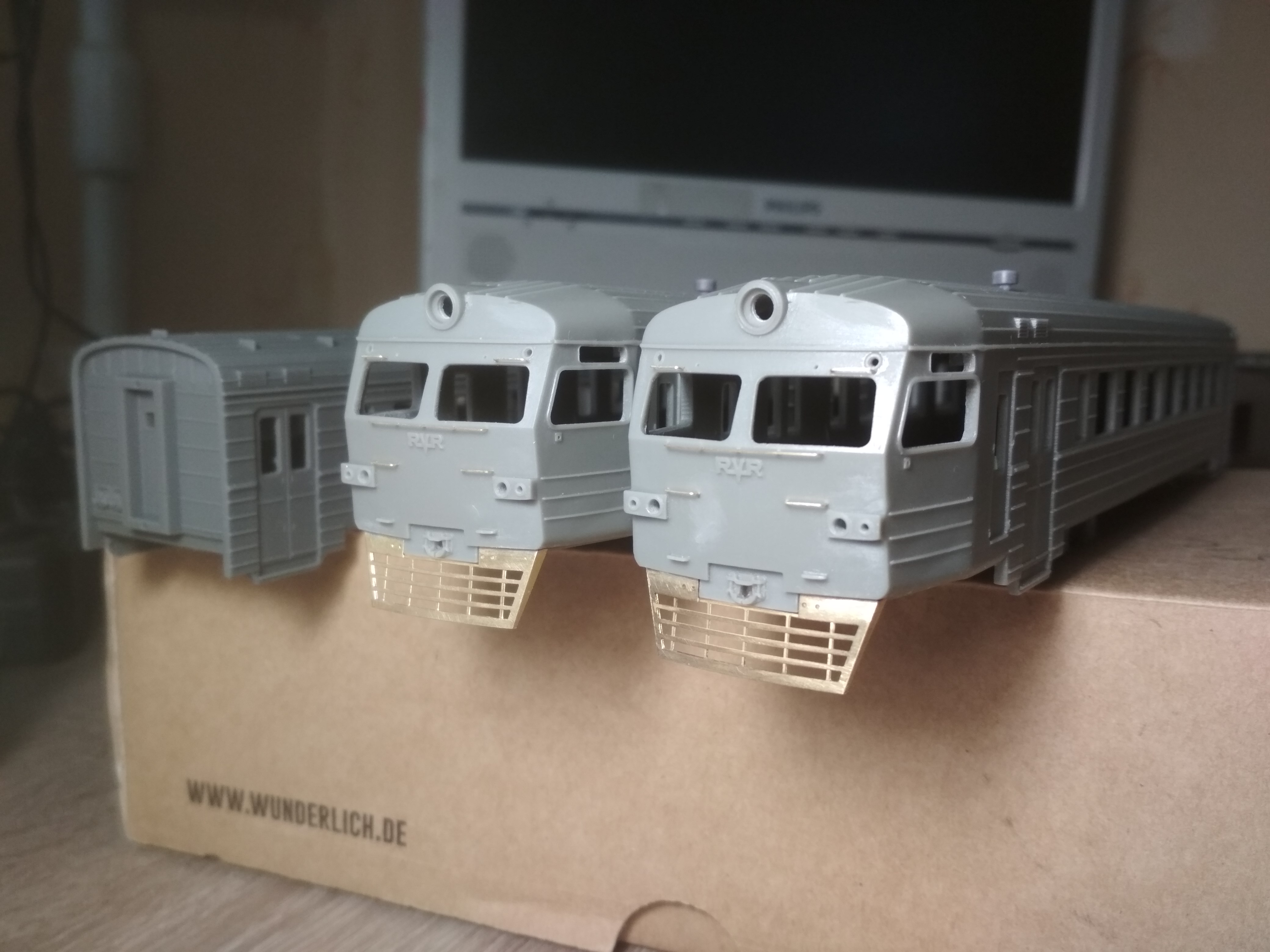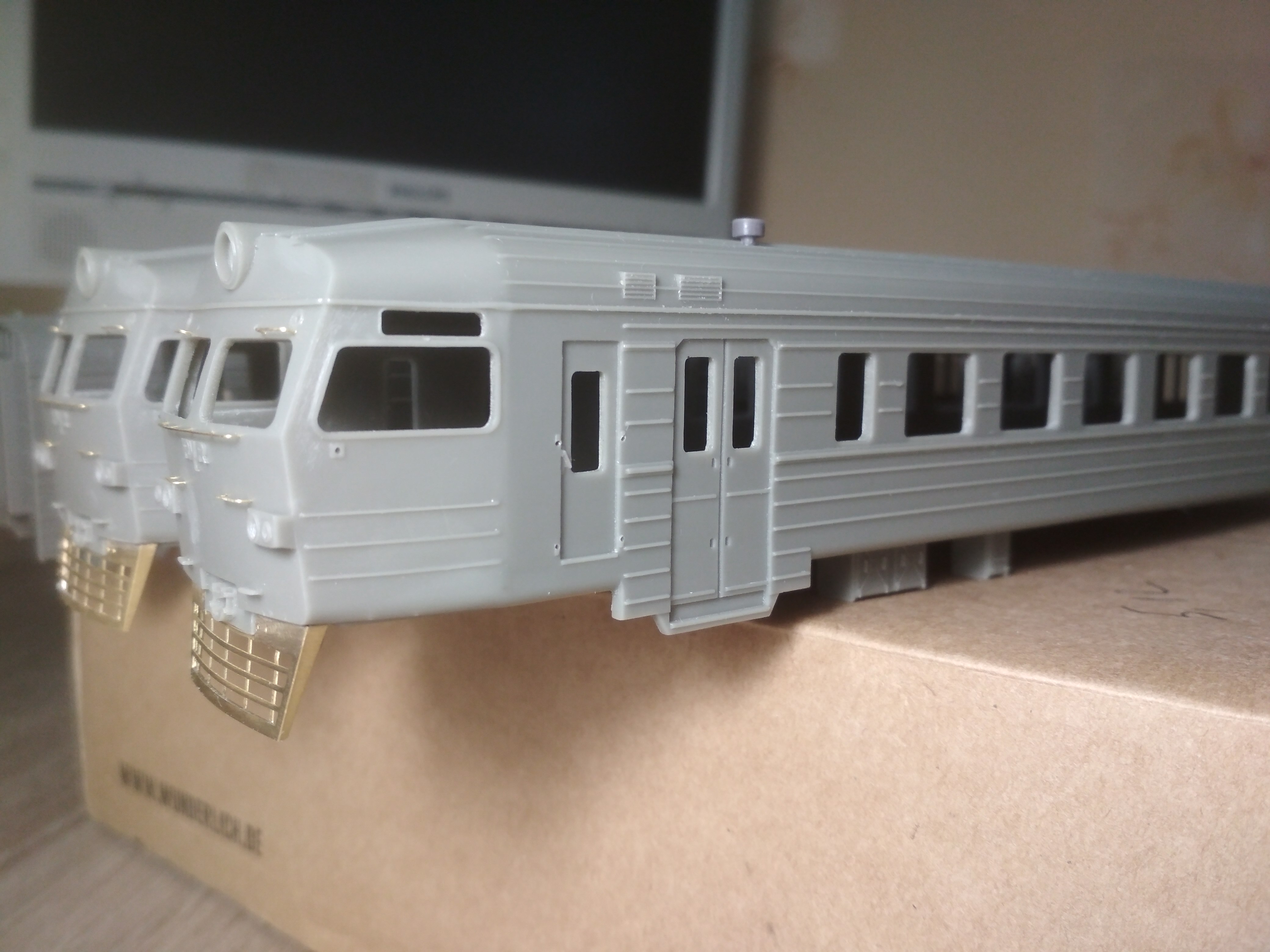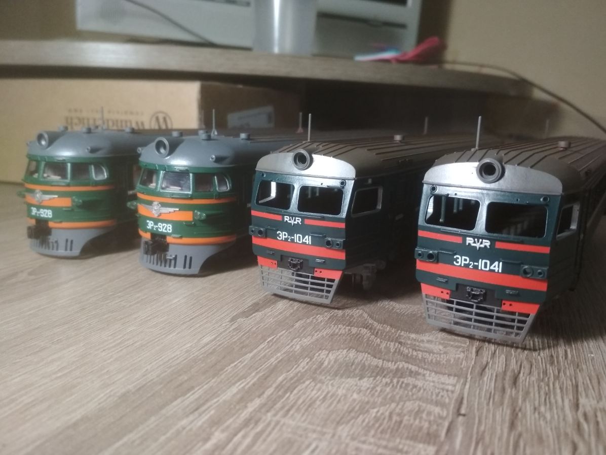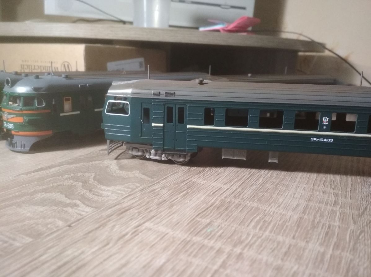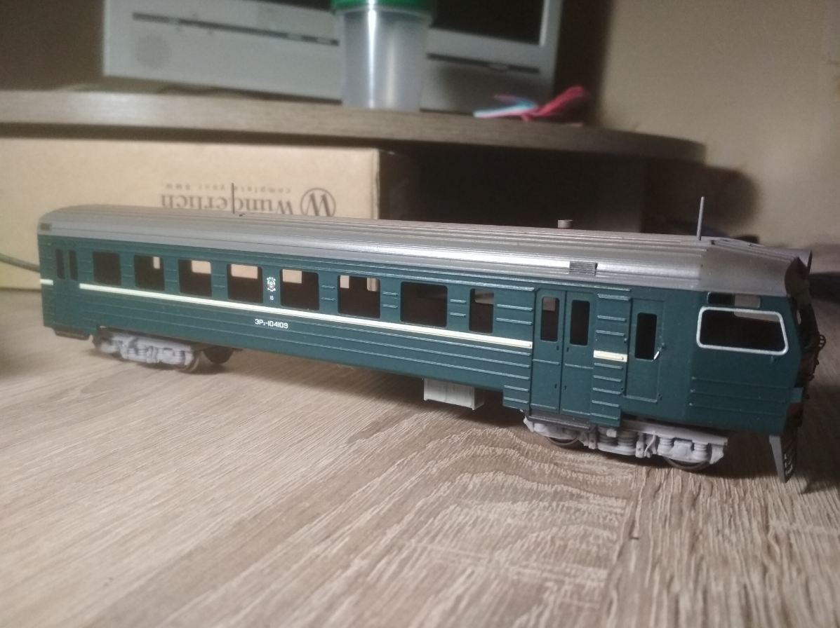 Практически готов к выпуску электропоезд ЭР2 в НО. В комплекте головные, моторные и прицепные вагоны. Заточен под ходовку Br114 ROCO. Ходовка располагается в моторном вагоне.