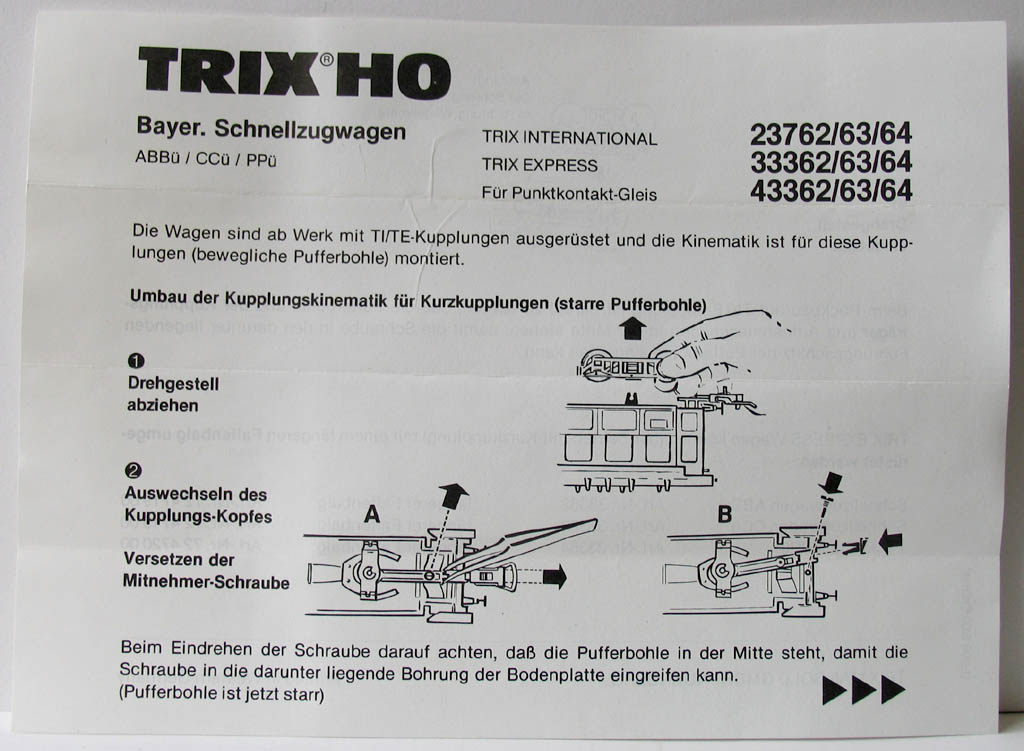 Вагоны также выпускались и в варианте Trix Express, с характерными сцепками старого образца, что бы новые вагоны можно было катать в одном составе с вагонами старых образцов.