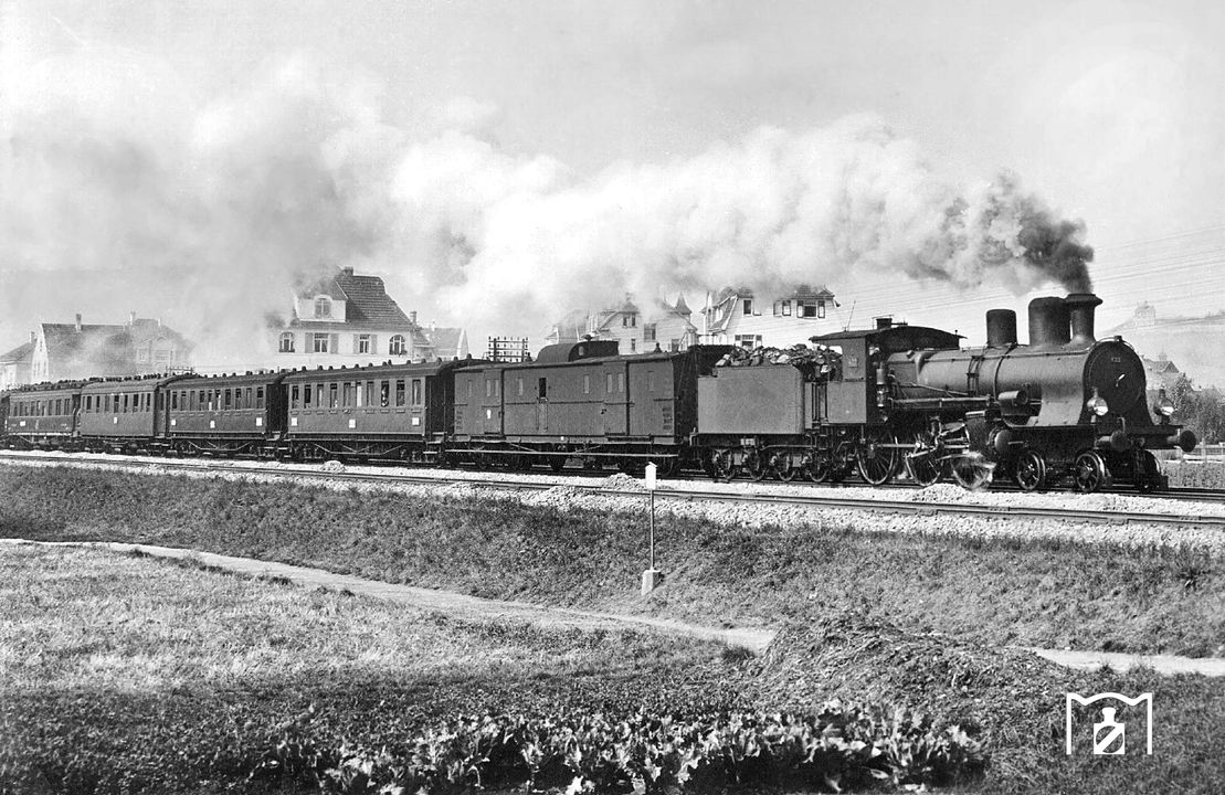 во главе состава вюртембергский (K.W.St.E.) паровоз класса D, за ним багажный вагон и два вагона 3-го класса Эльзас-Лотарингии (Els.Loth.), затем баденский (Bad.StB.) купейный вагон 1-2 класса, и за ним вагон-ресторан ISG, а далее уже не видно.