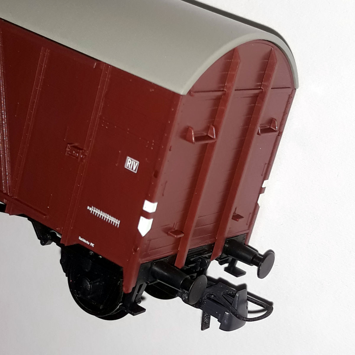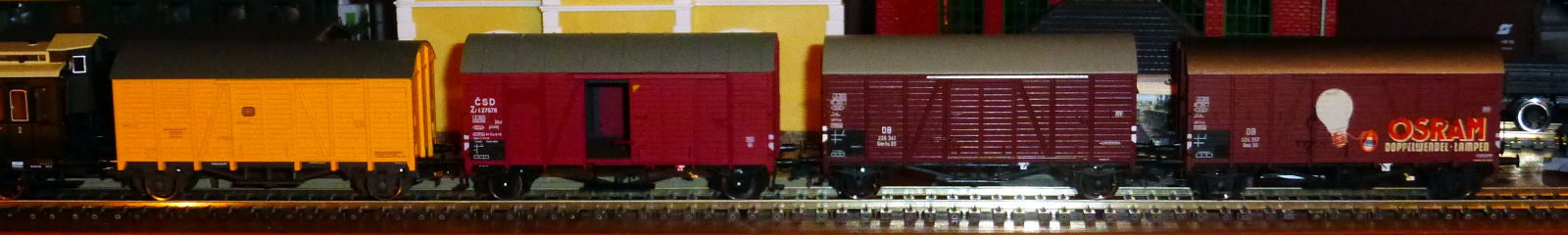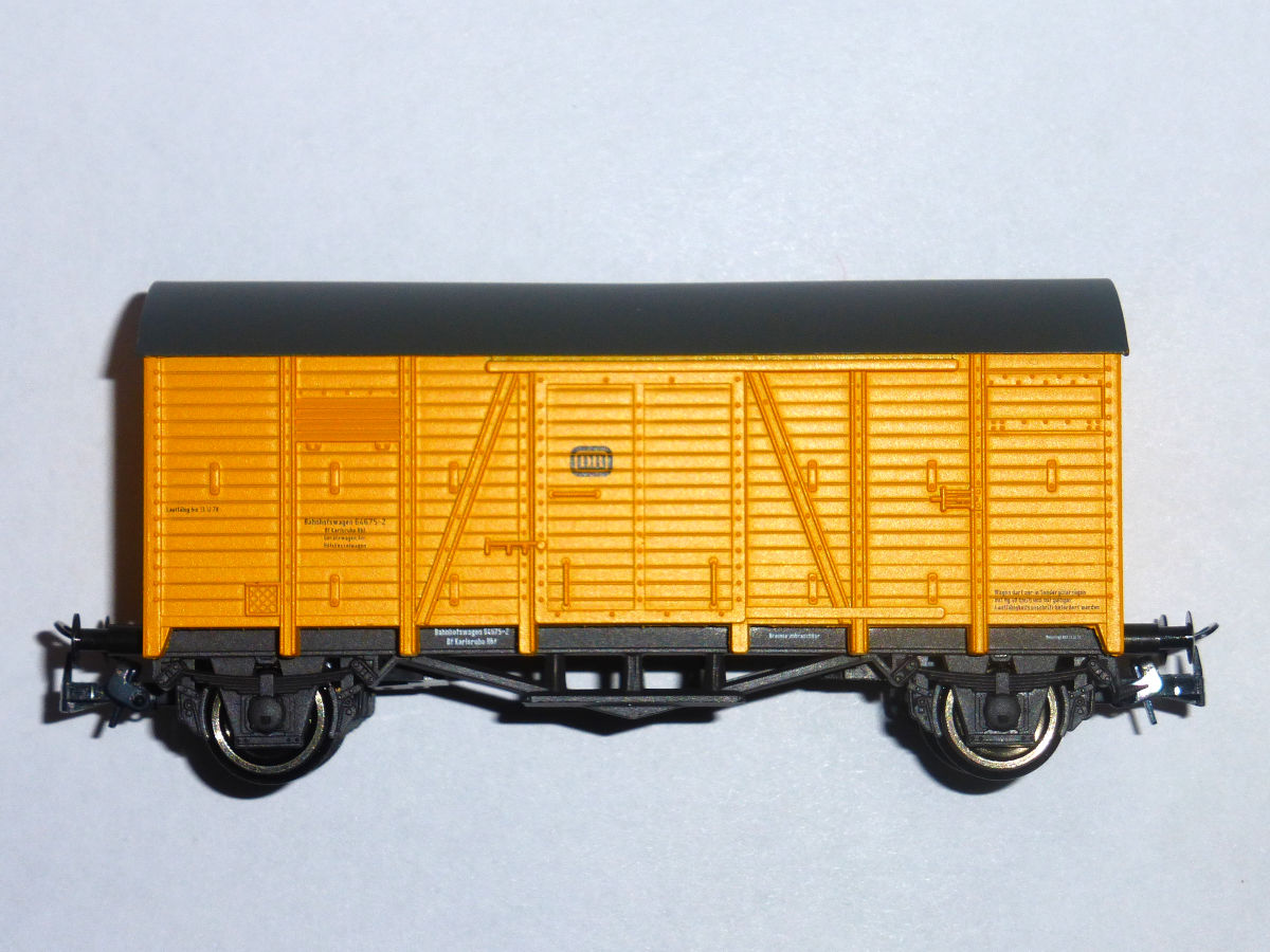 Брава пошла с крытыми вагонами по пути "чем ярче, тем лучше": если посмотреть на каталог, вагоны с рекламой всего, что можно вообразить и разных лет. Стиральные порошки FeWa, крем для обуви Erdal разных версий логотипа, вся промышленность от Круппа до куриных кубиков, пиво... Впрочем, что касается пива, это явный промах - нет смысла обшивать пробкой Оппельн, чтоб превратить его в термос, если есть специальные вагоны. Правда, были они на на шасси Касселя, но были специально построенными как термосы - это, однако, отдельная и немаленькая тема. Однако же, вернемся к Оппельну. Учитывая, что строить Оппельн стали в середине 1930-х, и использовали много лет после войны, а на конец 1940-х это был вполне еще современный вагон, реклама на нем вполне могла появляться. Отметим этот пункт, т.к. Брава кое-где прегрешила с рекламой, однако, в данном случае, все правомерно.