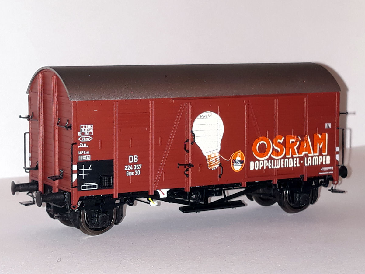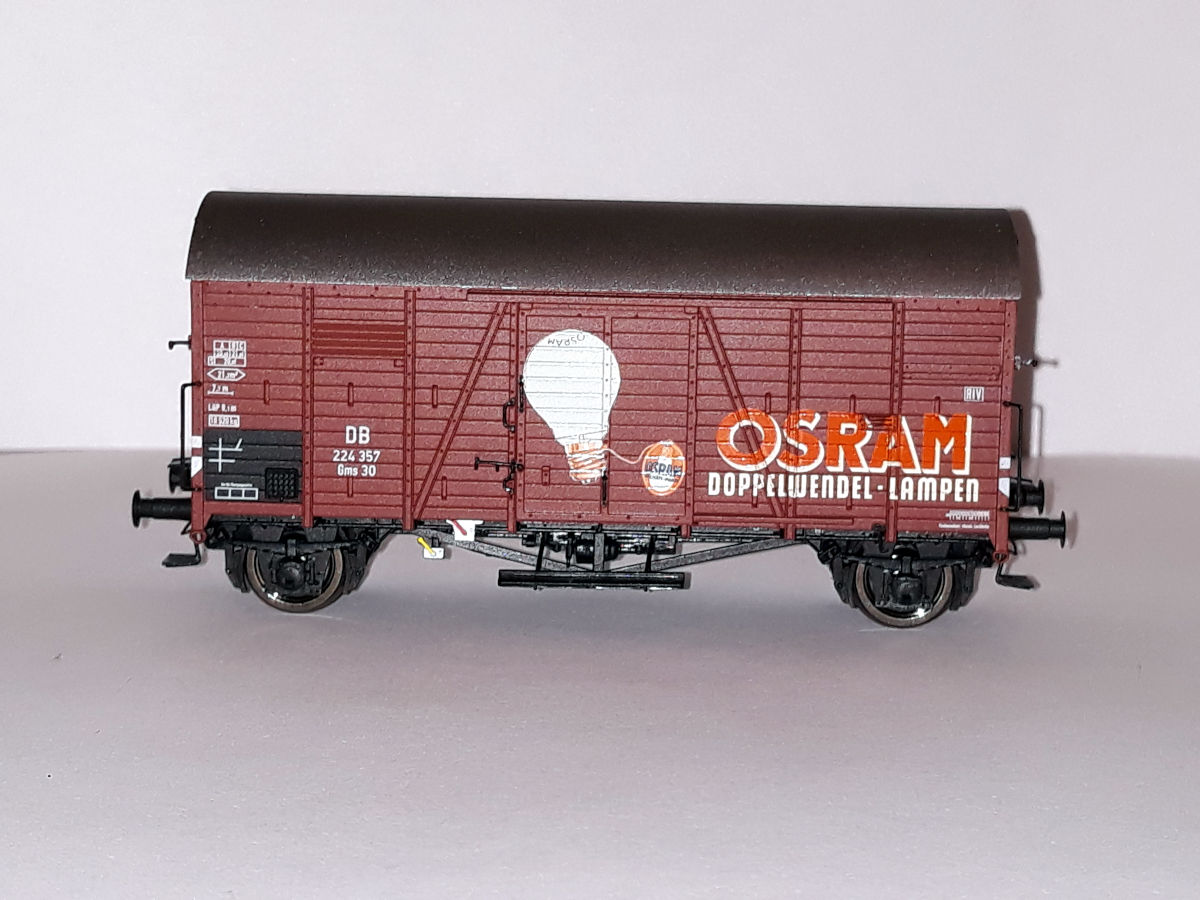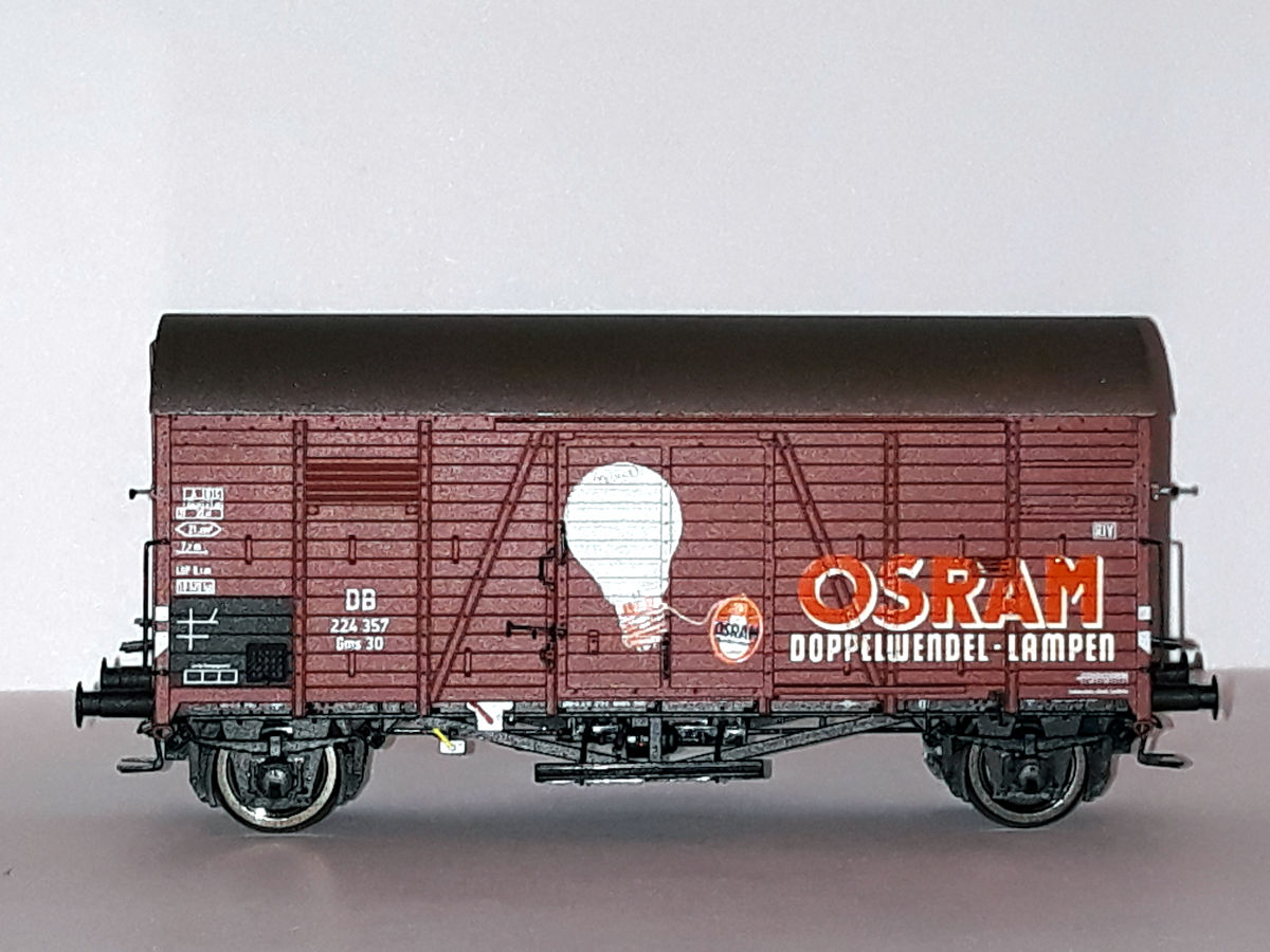 • Brawa 47963 (DB, III эпоха, обозначение Gрms 30 c послевоенной рекламой Osram)
