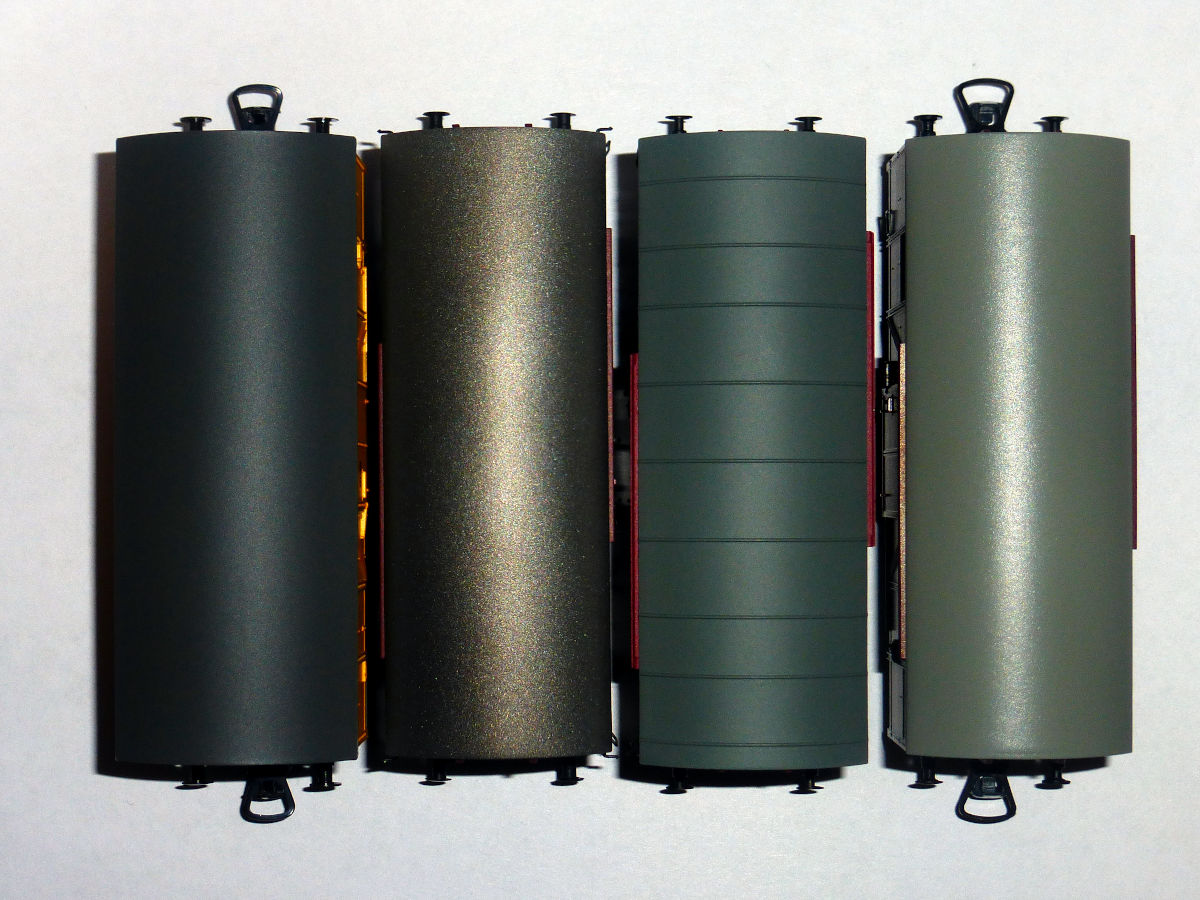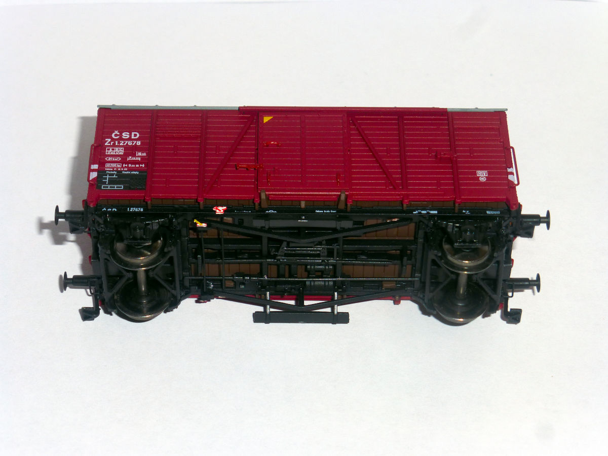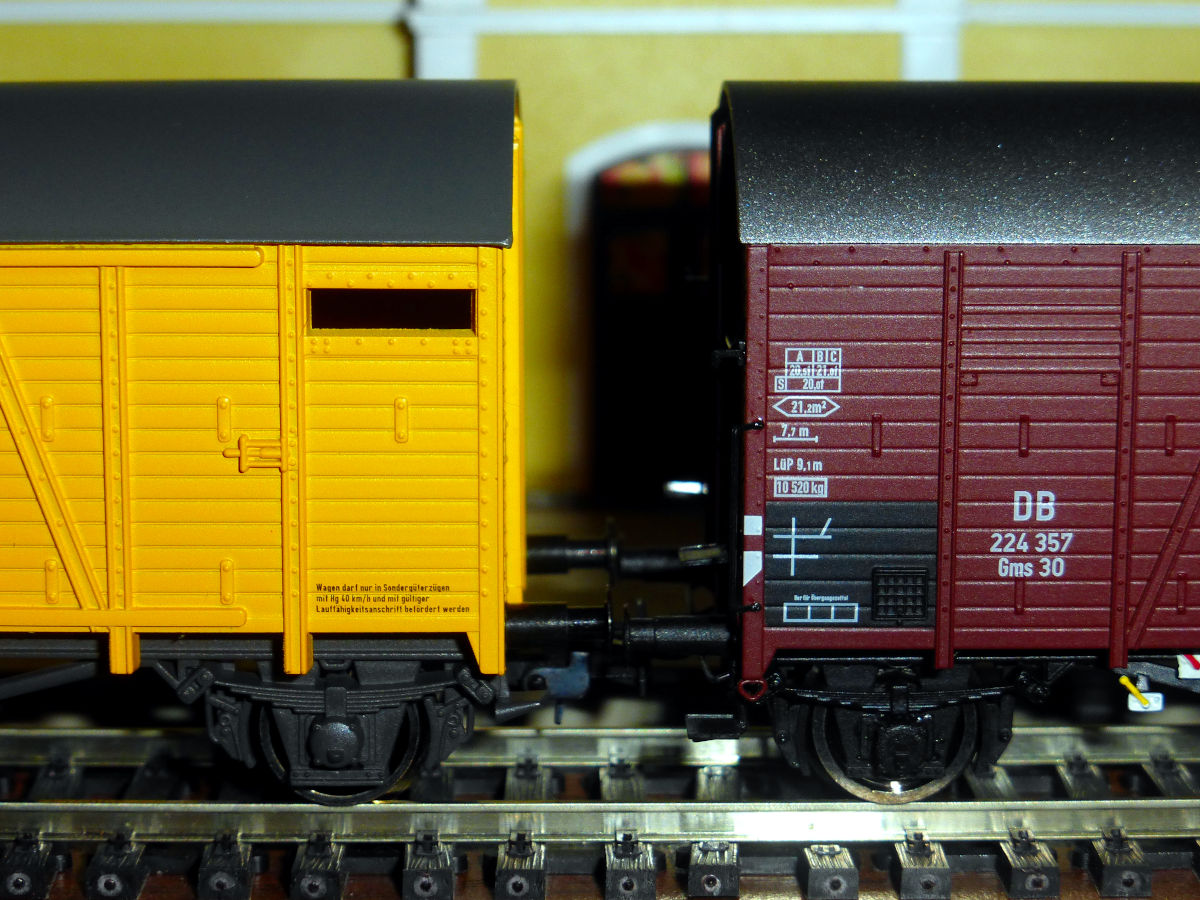Сразу оговорюсь, несколько покривил душой - не думаю, что кто-то на реальном макете поставит рядом два вагона, не поставив модельной сцепки. На фотографиях же она отсутствует, из-за чего буферные тарелки соприкасаются. Хорошо, что они хотя бы соприкасаются! Ни линия крыши на фото состава сбоку, ни высота конька крыши на групповом фото с торцами, ни длина вагона на фото сверху, ни высота буферов у этих моделей не совпадают! Ладно еще, не совпадает количество пластин в рессорах - и обозначение у вагонов несколько разнится, и в реальности число пластин могло отличаться - у настоящих вагонов могут быть все четыре буксы разные и даже с разными буксовыми лапами - прототипы попали в разные страны, и в послевоенной разрухе каждая дорога при ремонте меняла комплектующие на то, что было удобно и под рукой. Впрочем, к 60-м годам, которым соответствуют эти модели, хаос уже попрекратился, но что стояло к тому времени, то и было. Однако буксы здесь, как раз, все одинаковые. Но при этом:
