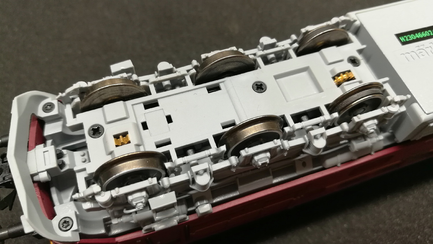 2. Вага локомотива не 675, а 604 грами. Різниця припадає на коробку, у якій зважував пан Ігор. Тобто, у моделі типова "машкова" вага: "Піко" та "Роко" десь по 530-550 грамів. За рахунок металевого кузову, раму зробили меншою, і в отриманий простір засунули повно цифрового приладдя. Не стали робить як "Гутзольд", у якого Br 119 забитий чугунієм під самий дах та важив близько кілограма (при цьому візки на ніжних пластикових защьолочках, ага). Чесно кажучи, люблю важкі моделі, але не ціною надійності та якості.