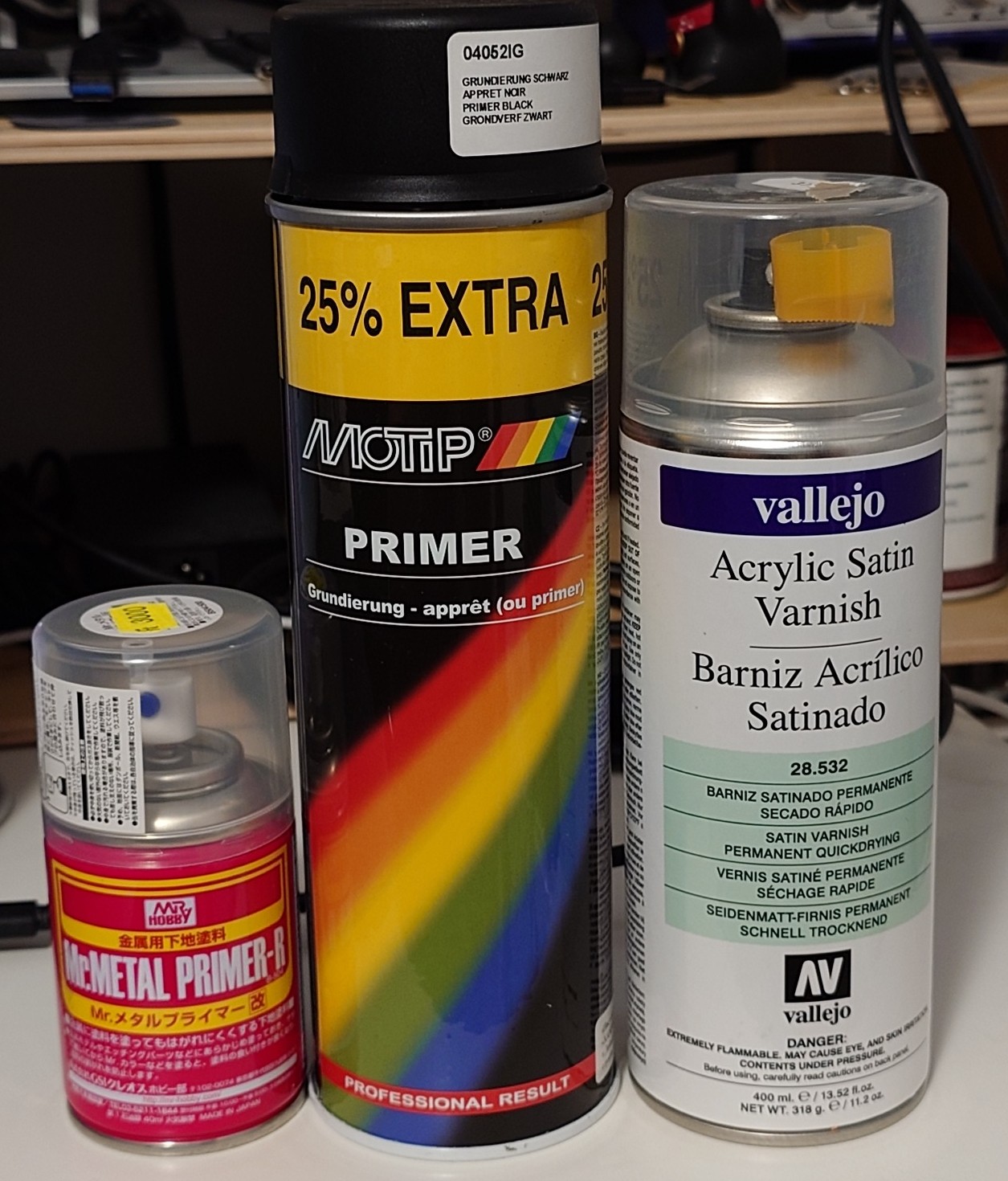 Последовательность слева-направо: Сначала задул грунтом по металлу, потом обычным черного цвета в 3 слоя. Потом лак - 2 слоя