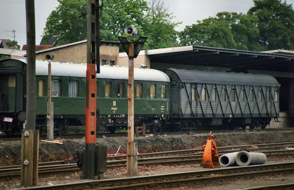 Для тех, кто не в курсе - "эрзац-вагон" появился во время Второй Мировой, когда из разбомбленных пассажирских вагонов максимально дешево и сердито восстанавливали вот такие "сараи на колесах". Впрочем, эти вагоны ездили и после войны, и довольно долго. К примеру, вот фото из ФРГ - "эрзац" используется в качестве багажного: