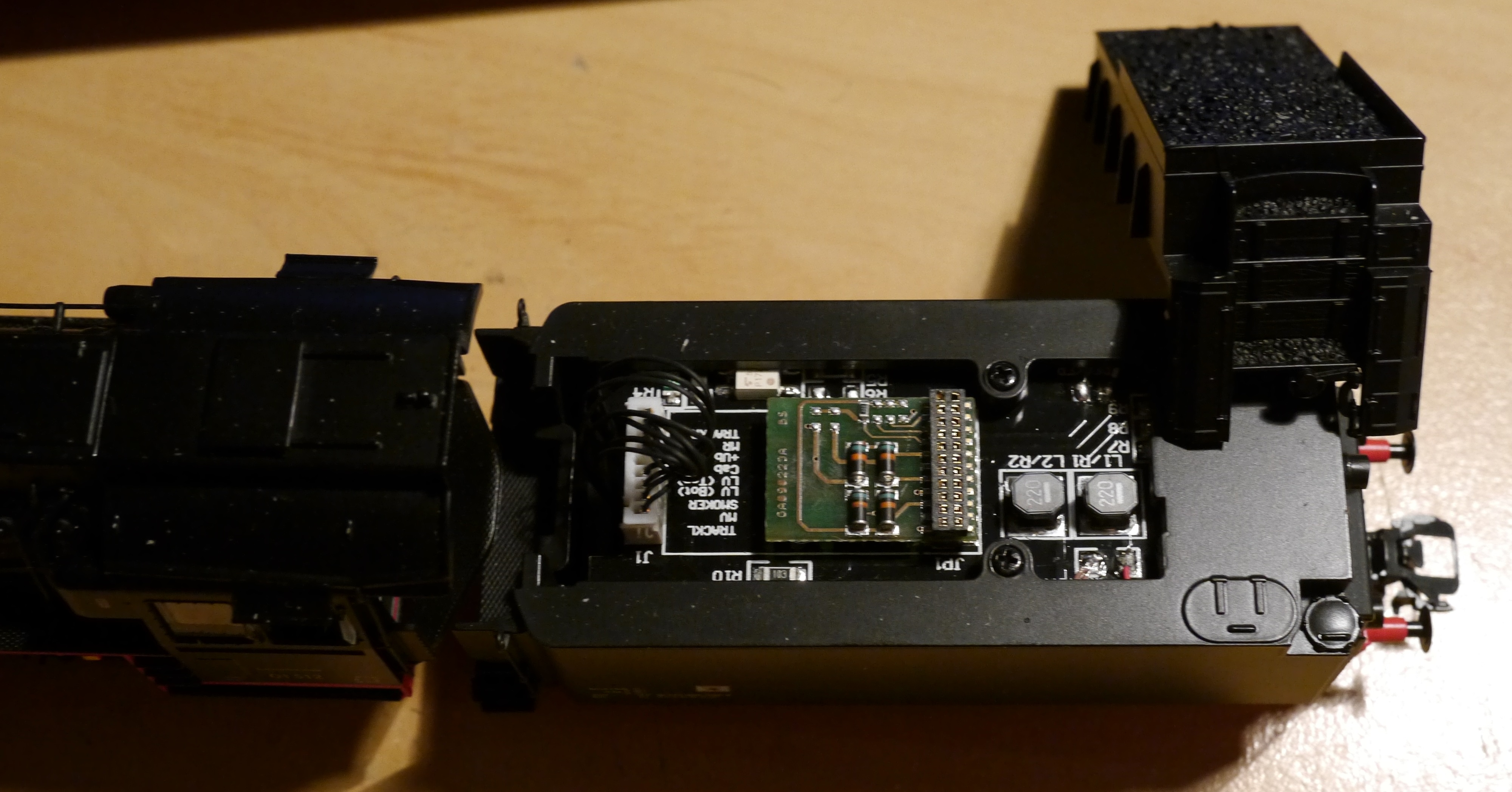 Также хочу отметить продуманную конструкцию в плане обслуживания. Например, не надо разбирать паровоз до винтика, чтобы вставить декодер. Достаточно снять угольный бункер (на защелках), чтобы получить доступ к плате: Есть и немного дегтя. Почему-то на модели отсутствует часть тормозного оборудования. При этом на некоторых фото по артикулу 22905 есть паровозы, у которых оно установлено, а на некоторых - нет! При этом никаких креплений на своем паровозе я не обнаружил. Есть мнение, что наличие/отсутствие этих деталей зависит от периода выпуска моделей (на ранних - отсутствуют). Игорь вложил бонусом в коробку нужные детали от другого производителя, но до обзора я их не устанавливал.