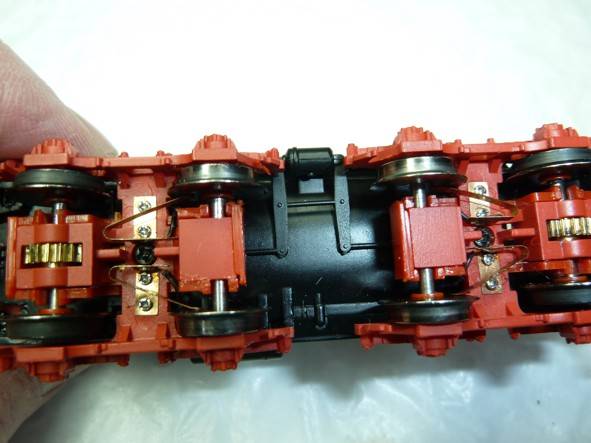 Ходовая часть: Как видите, привод в тендере. На две крайние оси. Телеги тендера жестко закреплены в раме. Шестерни на осях колпар - латунь, промежуточные - пластик, а червяки тоже металлические. Я так подозреваю, что такое сочетание делает трансмиссию менее шумной, чем полностью металлическая?
