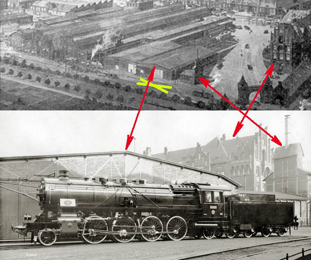 и сравнение с фото (место примерной дислокации паровоза отмечено желтым):