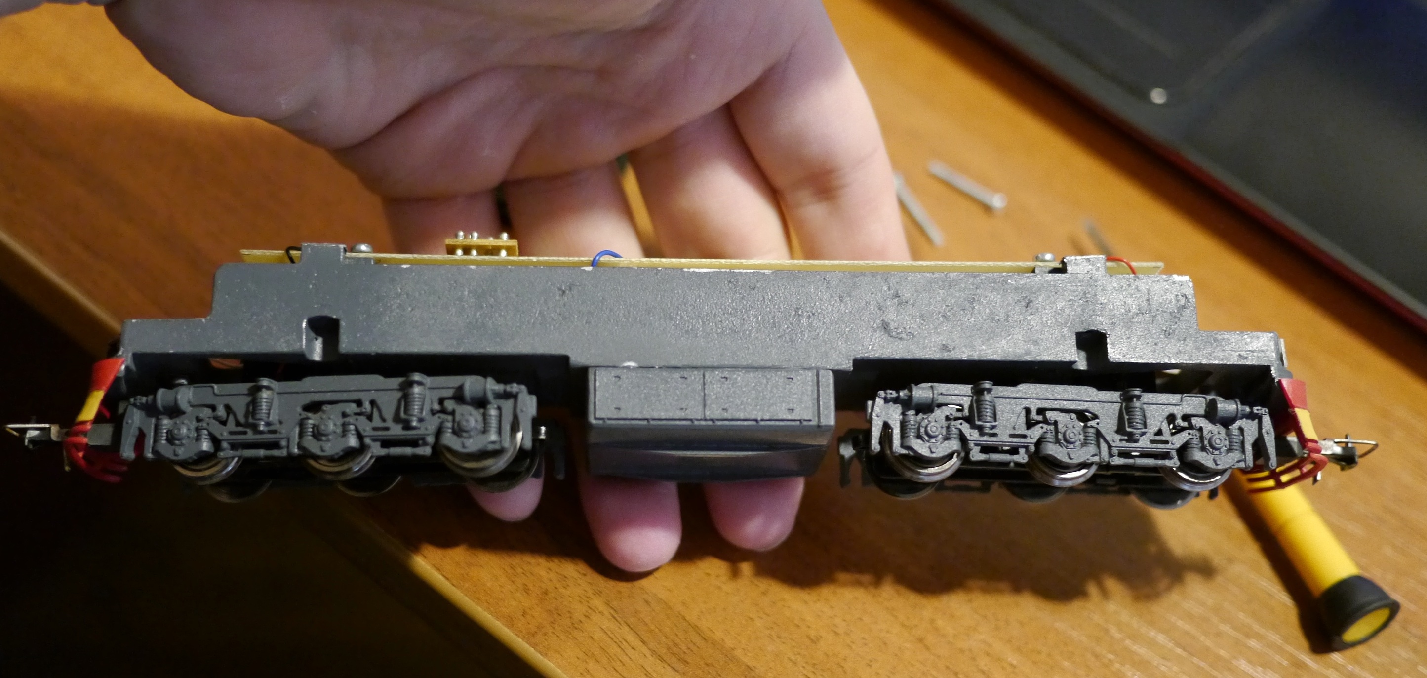 Снимал фотоаппаратом, потому если звук не очень хорошо слышно - извините. Если на словах, то при движении вперед кабиной А модель издает явно лишние звуки. При снятом кузове хорошо видно, что в одну сторону карданы крутятся хорошо, во вторую - есть биение. Наше с Денисом мнение - дефект в самодельных карданах. Пока устранением не занимался, будет время и желание - разберу.