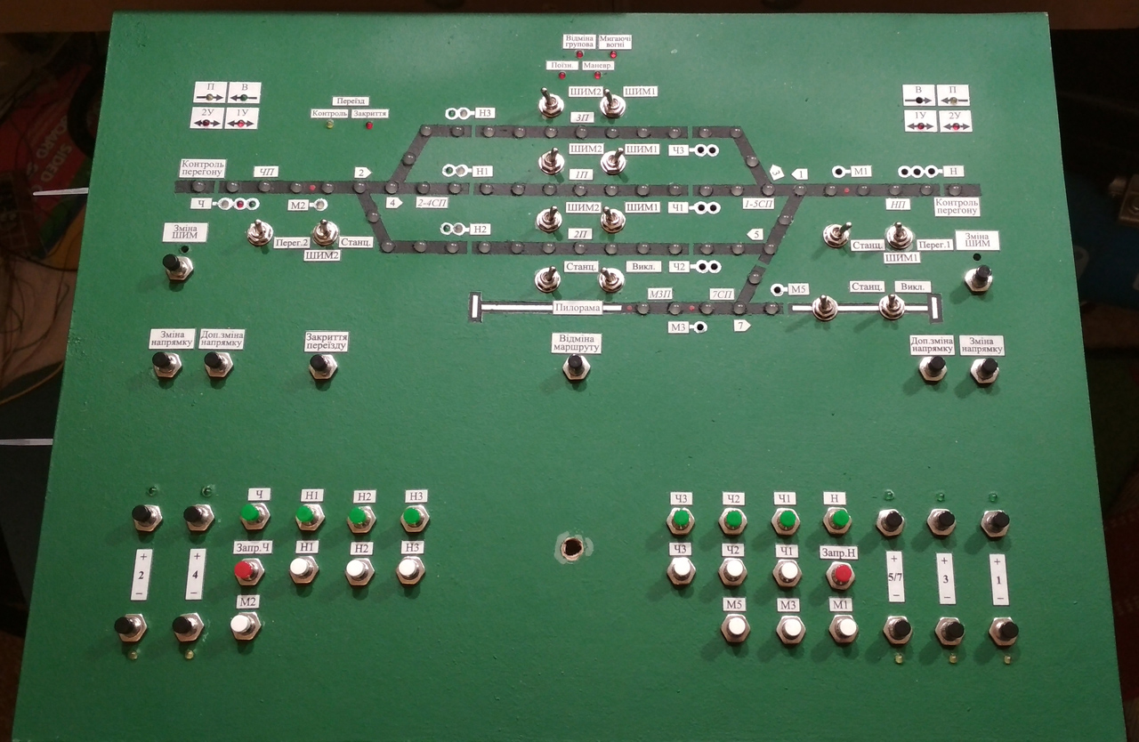 Довго не було новин, оскільки робота, інші проекти з електроніки, музей вузькоколійних залізниць забирають багато часу. Але, по можливості, помалу пиляв і випиляв наступне. Готовий пульт керування, зібрані майже всі електронні компоненти. Ядром ЕЦ буде Arduino Mega 2560 з розширювачами PCA9685 для керування світлоіодами пульта та вогнями світлофорів по шині І2С. Індикація заданих маршрутів за допомогою двоколірних світлодіодів (зелений/червоний). Окремим модулем буде Arduino Nano з PCA9685 для керування сервоприводами стрілок на двох модулях. Така реалізація дасть змогу керувати стрілками без основної програми, поки не буде закінчено другий модуль. Почато написання програми ядра. Реалізовано один поїзний маршрут, відміни поїзного і маневрового (з відповідними витримками часу), посекційне розмикання маршруту в міру руху поїзда, рейкові кола. Організовано живлення різних кіл через індивідуальні запобіжники з контролем перегорання. Поки проводжу монтаж, тому нічого толком не ув'язано і джгути не закріплені.