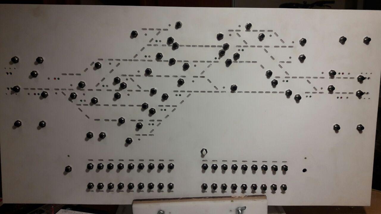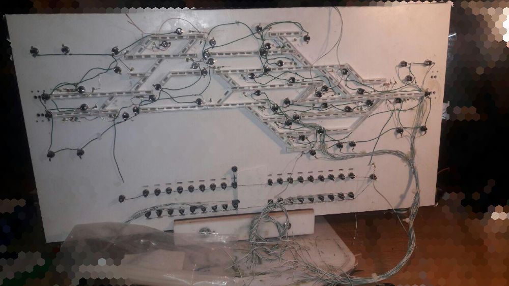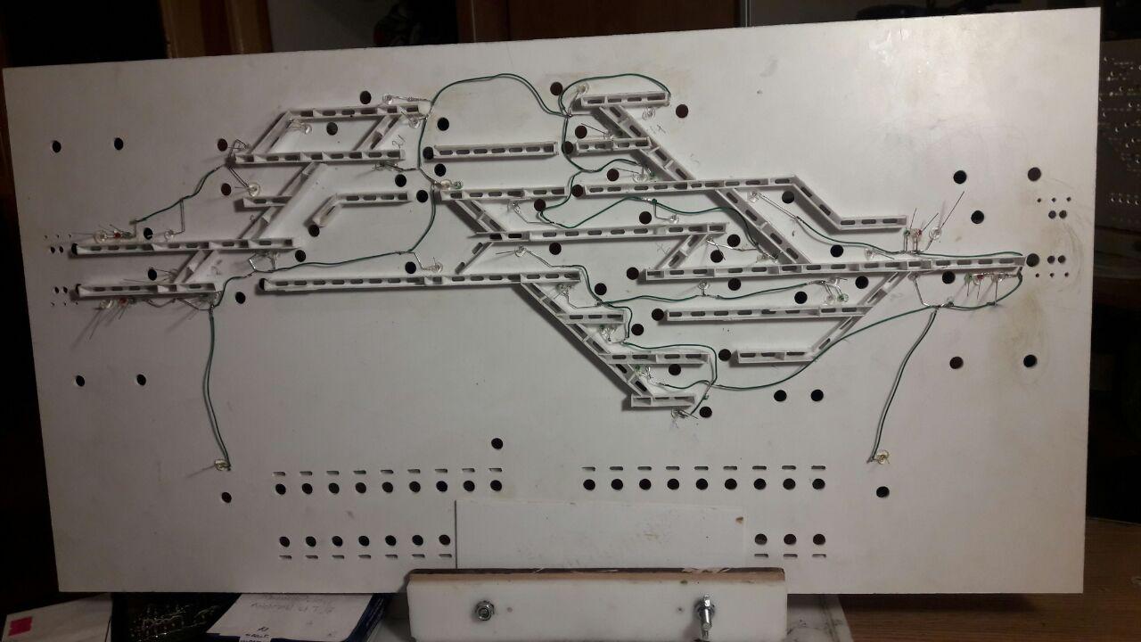 Под макетом будет стоять две ардуины и одна пульте. Макетные ардуины отвечают за перевод стрелок и принимают сигналы с токовых датчиков ( отслеживание поезда на определенной секции (участке) макета), в свою очередь обработав этот сигнал отправляют его на ардуину, которая находиться в пульте. Пультовая ардуина отвечает за полностью всю индикацию на пульте и положения кнопок, и подает команды на ардуины под макетные для превода стрелок. Для размножения входов и выходов ардуин используется элементы логики 74НС595 и 74НС165