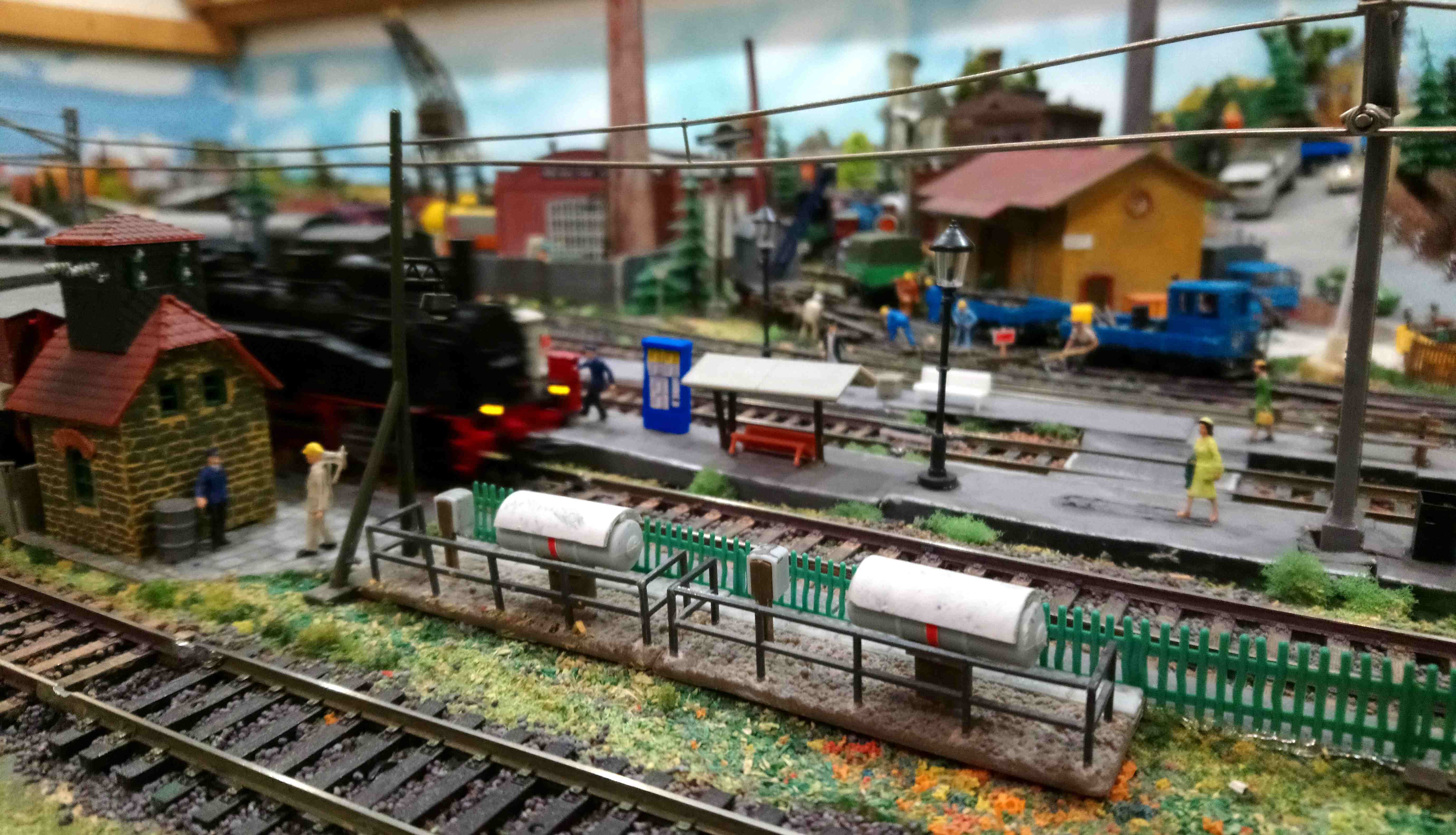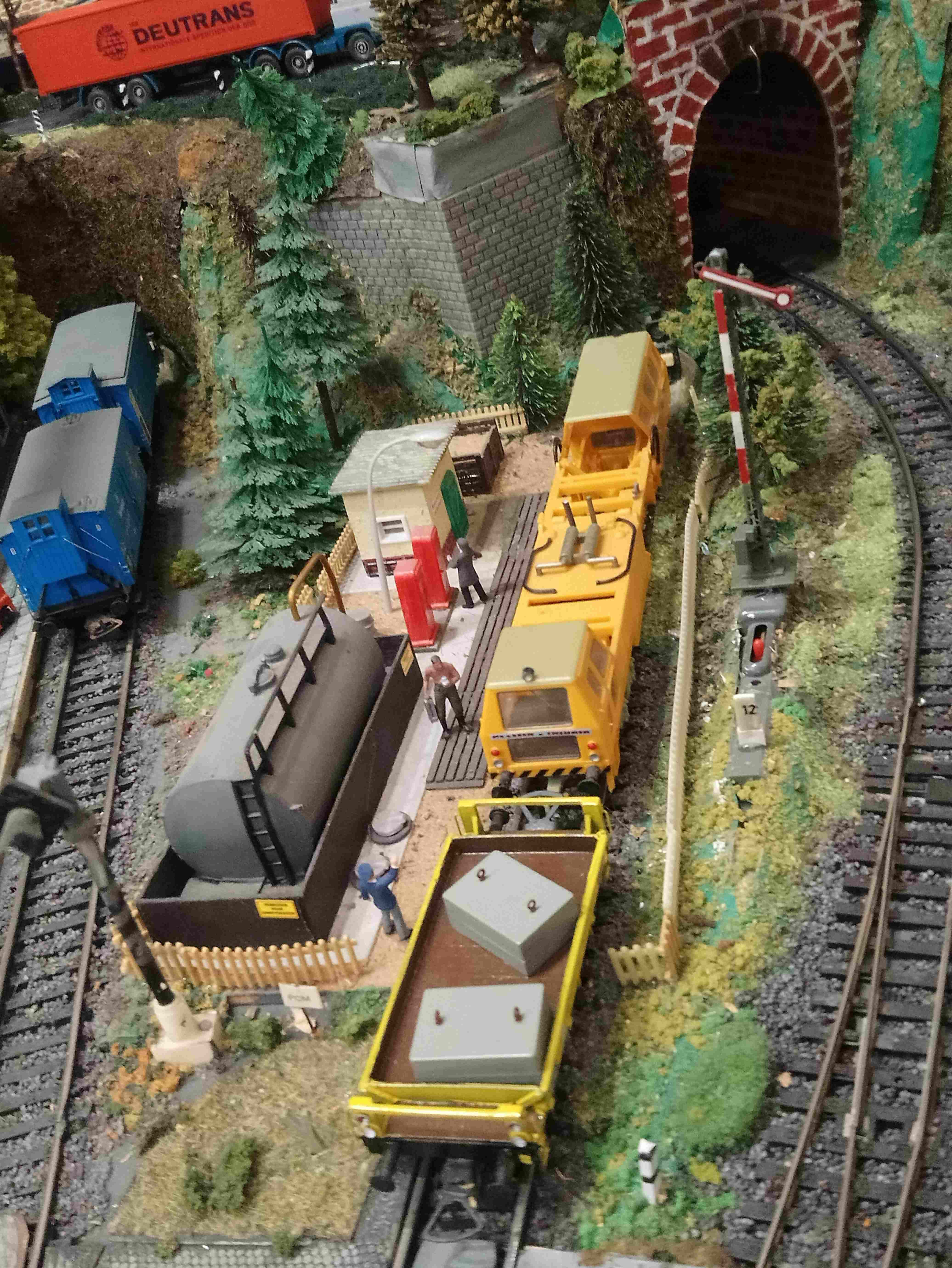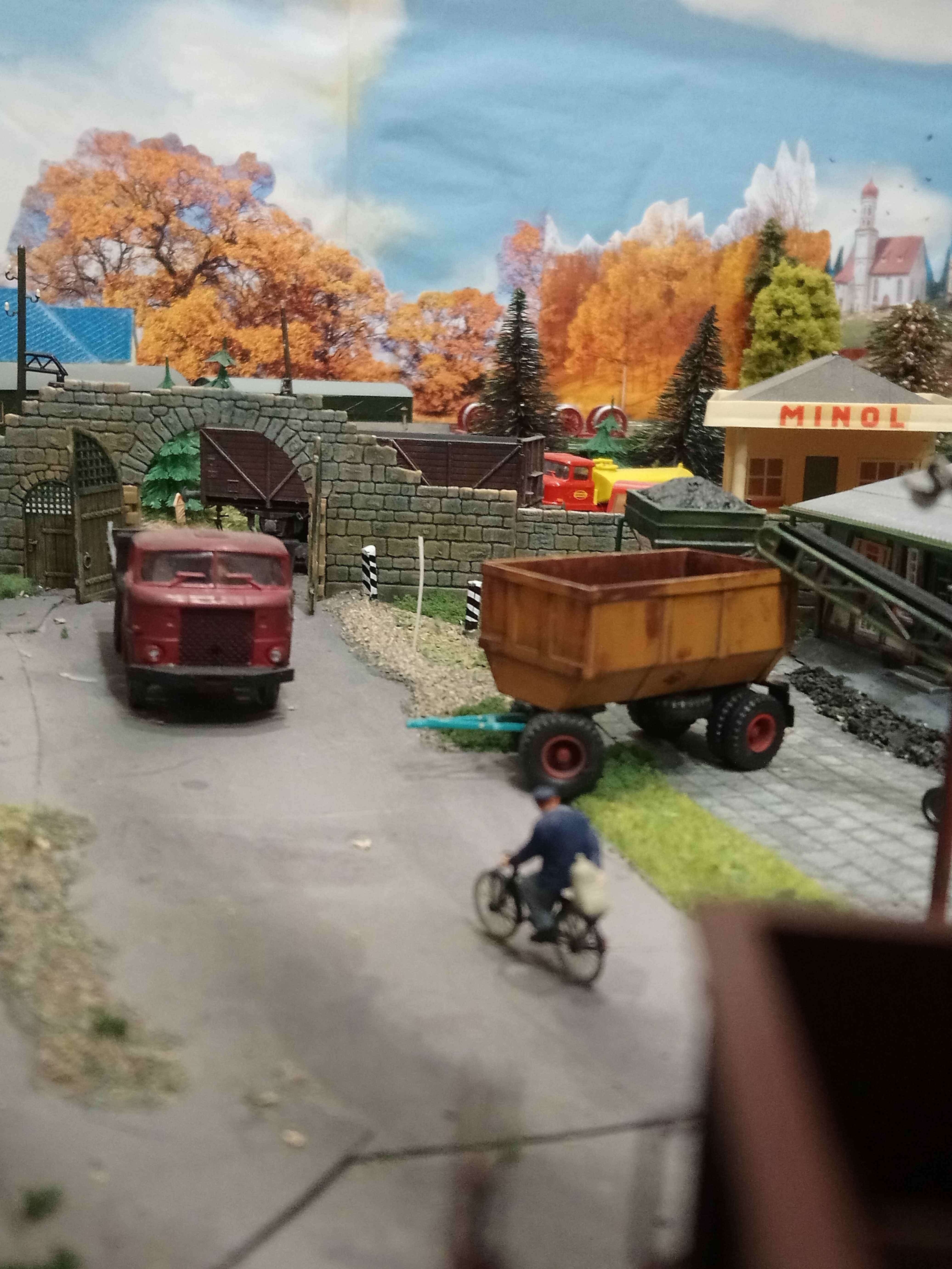 Расставил новые машинки.Баркас техпомощь расположилась у гаражей и Вольво,который на рампе. Пара авто с лесниками заправляются на заправке. Доставка грузов расположилась в жилых домах. Фронтальный самосвал катается на угольной погрузке. Также при общей,кажущейся, перенасыщености макета удалось разместить тела,на двухколесных