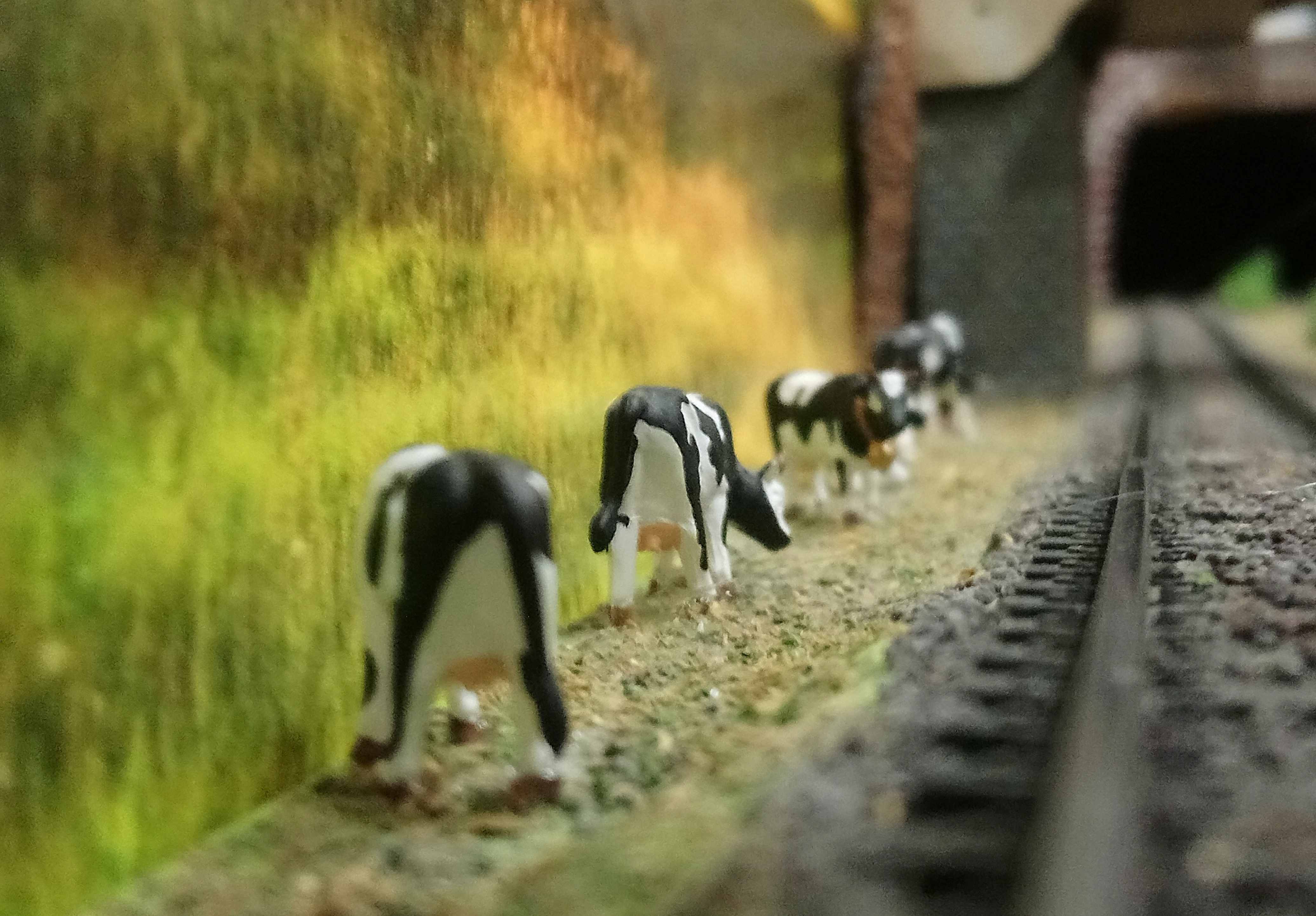 На заднем фоне в виде поля,рядом с путями удалось разместить небольшое стадо.На удалении