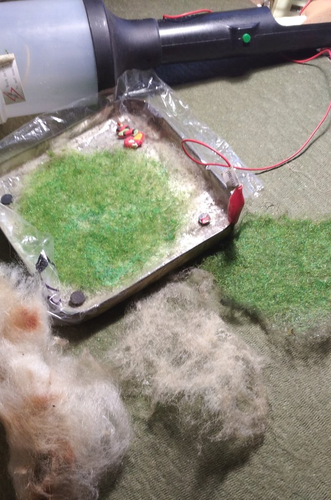Начитавшись у соседей про флокирование, сегодня провёл очередной эксперимент. Первый раз флокировал непосредственно на макете и остался недоволен - ну не стоит трава хоть ты тресни. Вот я и решил для себя попробовать по-новому. Старый синтепон растянул до состояния паутины, промазал густым ПВА и присыпал флоком: присыпал-стряхнул-присыпал стряхнул. Высушил и повторил операцию. Пока, как по мне, нормально, появился объём. Думаю ещё сверху задуть ПВА с водой (1:5...7). На макет буду рвать и клеить.