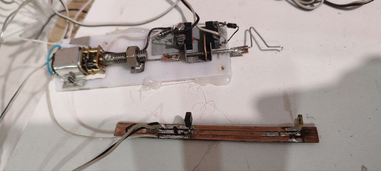 один из стрелочных механизмов. Пластинка нажимает на микрики от мышек, которые выключают двигатель. Скоба из скрепки имеет некоторую упругость, что позволяет не ломать механизм, но прижимать остряки. ПС будет фиксироваться фотоэлементами со светодиодом на рельсах.