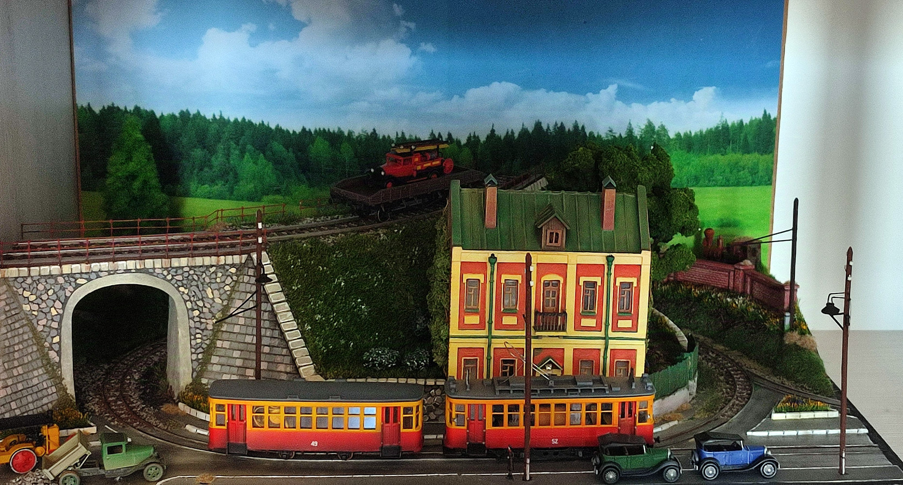 некоторое время назад youdmit выкладывал на формуме задник что он купил у китайцев. Я искал когда то тоже, но не подумал что он есть на Али. Поискал и выбрал такой же, как самый подходящий, только маленький. Макет стоит в книжном шкафу, поэтому делать и сбоку фон смысла мало, так как там створки дверцы. В жизни фон выглядит чуть лучше, чем на фото, так как почти полностью перекрывает поле зрения на макете