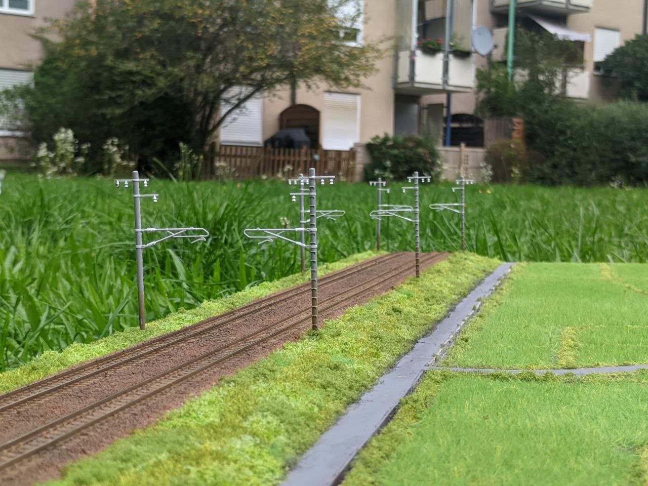 Рельсы флекc Kato 20-001; столбы КС Kato 23-066-1; подмакетник Pikart; балласт Busch 7062