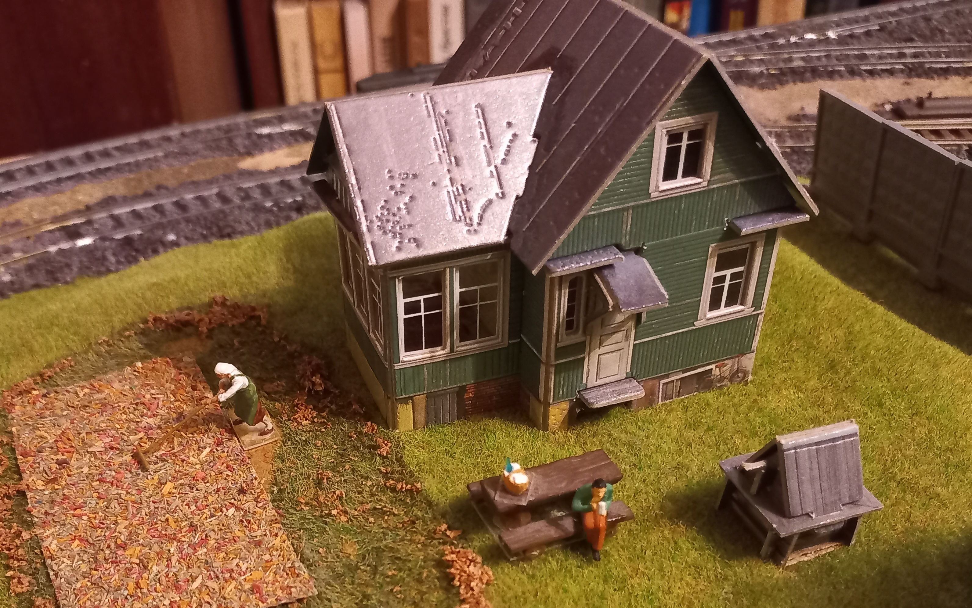 Также начал понемногу населять макет. Есть некоторое волнение - насколько живучей окажется мелочевка с учетом тягания макета туда-сюда... практика покажет. В любом случае, хочется "оживить" его сценками.