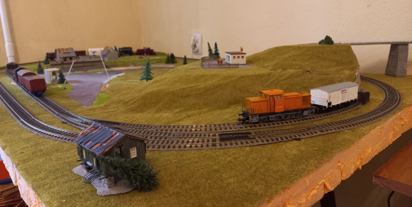 Вікторе, дуже гарний макет с цікавим рішенням. Головне баланс "рейки - місцевість" виконана. Впевнений, що при гарному архітектурному наповненні вийде дуже гарна річ. Стосовно "задніка" спробуйте рішення "плакат на каркасі, що встановлюється на на вертикпльних направляючих.