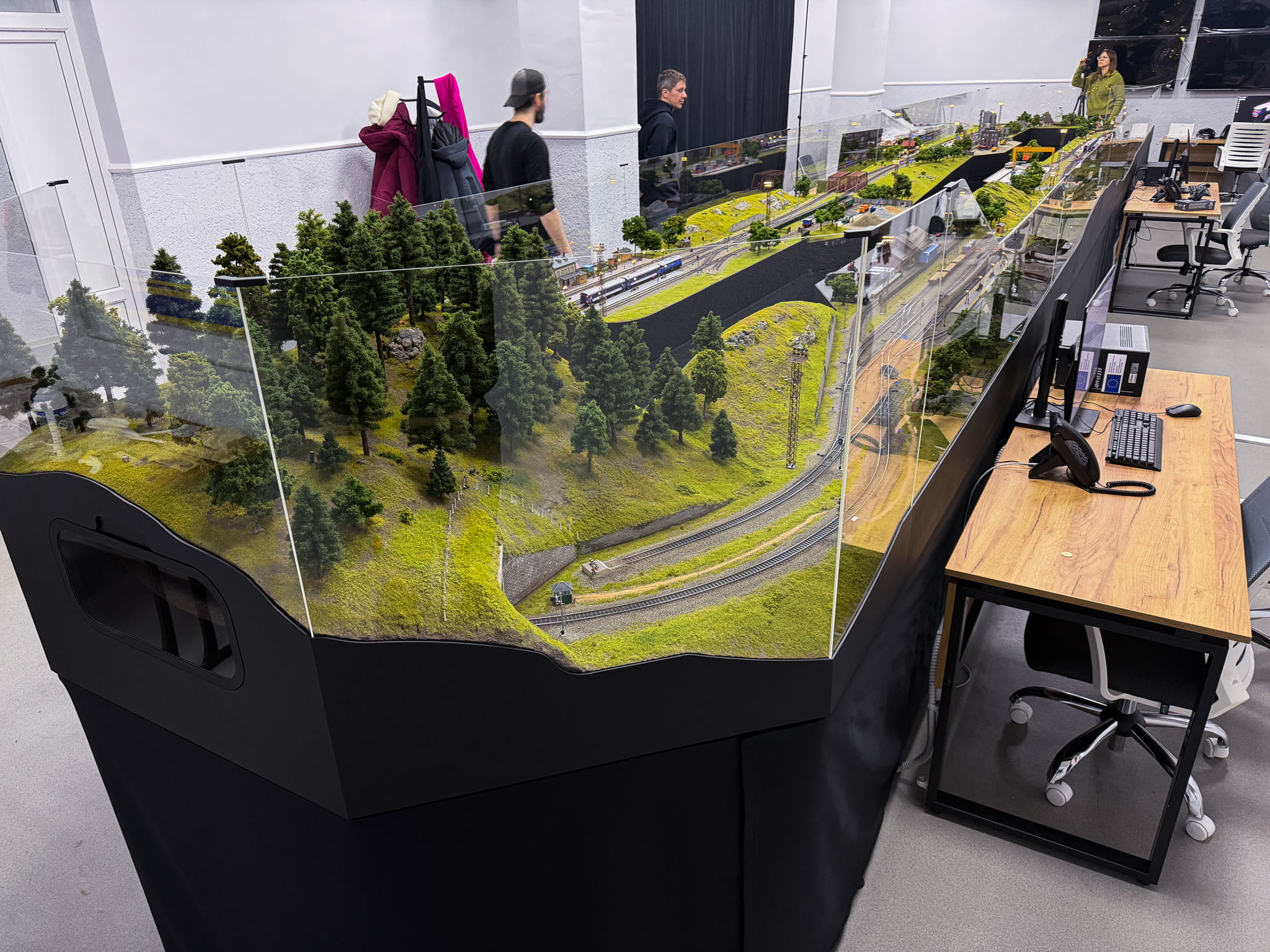 Діючий тренажерний комплекс з організації руху поїздів є багатокомпонентною навчально-демонстраційною системою, що включає масштабний макет (1:87) умовної залізничної ділянки, елементи залізниці, архітектурні об’єкти, декоративного ландшафту, елементи інфраструктури, моделі рухомого складу, а також робочі місця диспетчера та чергових по станціям з пультами керування, створений з метою імітації роботи залізничних станцій та навчання алгоритмам управління рухом поїздів.