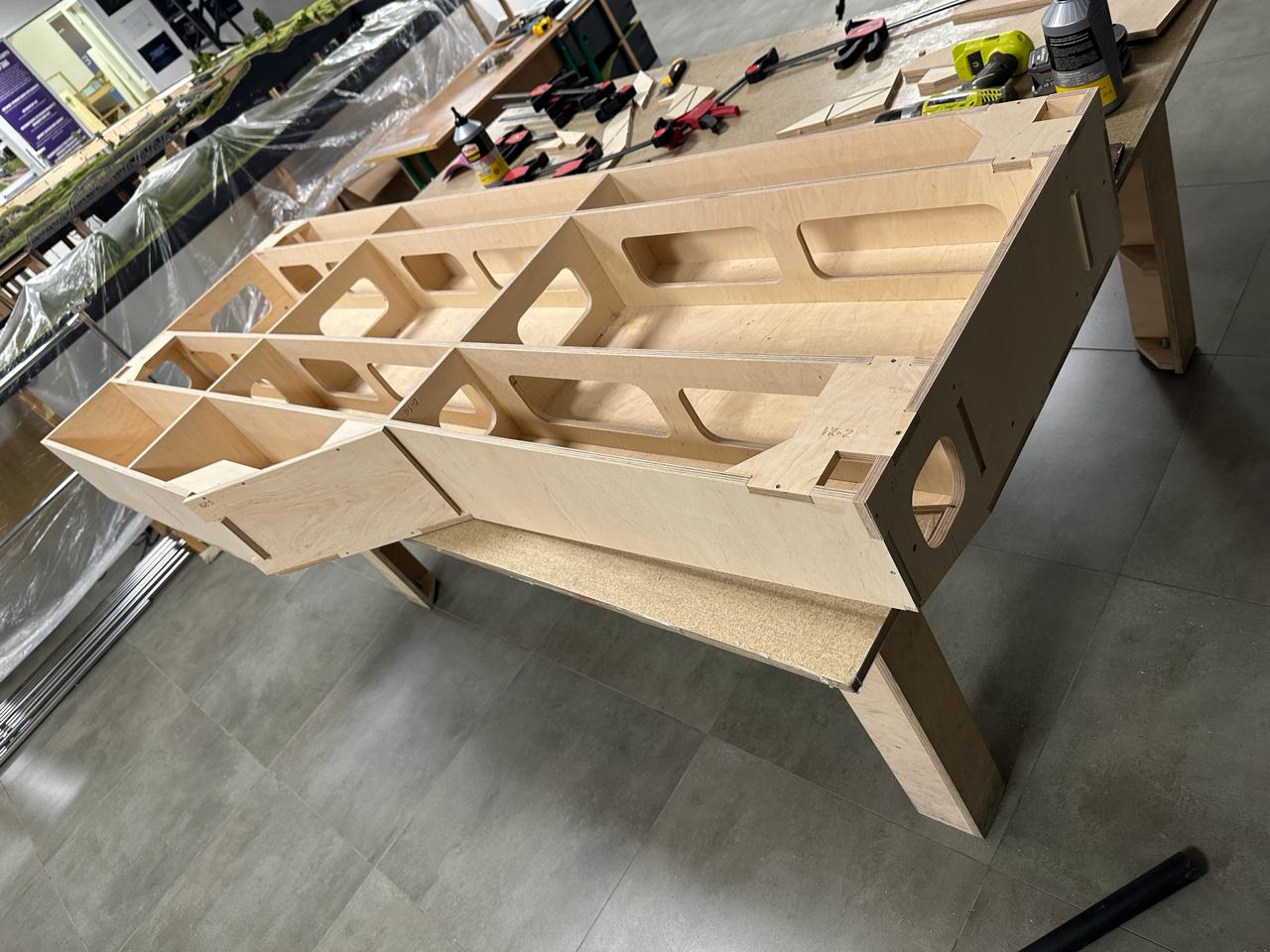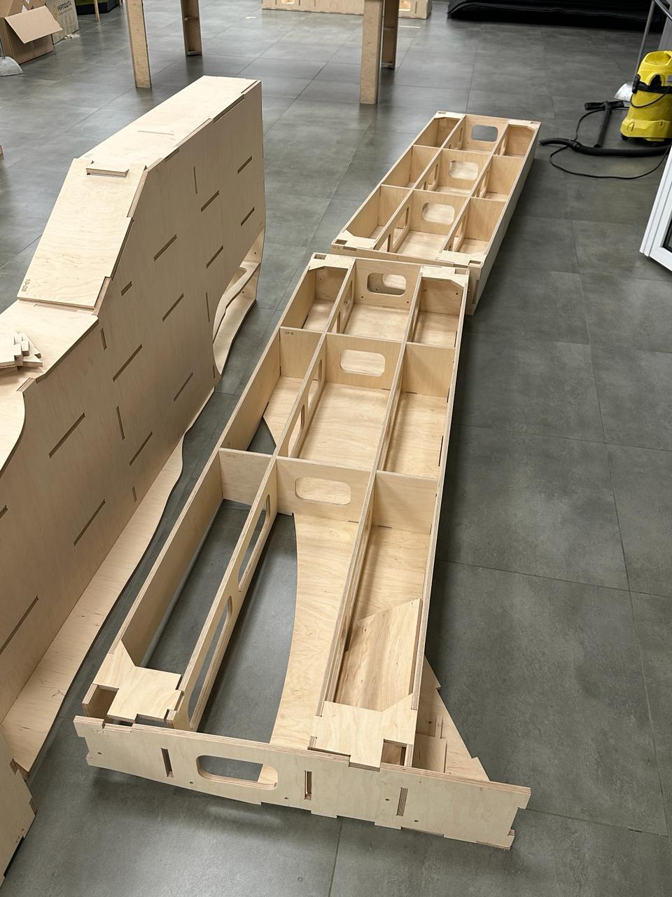 Матеріал обраний фанера 12 мм товщини, технологія виготовлення - однозначно фрезерування. Переваги фрезерування - відсутність нагару від лазеру який бажано зачищати перед склеюванням, 100% збереження геометрії деталей. Відповідно якість і процес збірки - одне задоволення. Креслю я в архікаді.