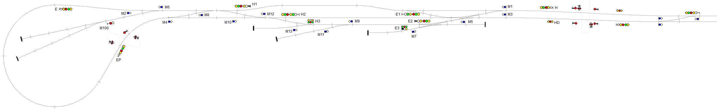 * М8 и М10: тут зависит от полезной длины пути (между предельными столбиками), который они ограждают. Если туда помещается хотя бы один вагон, то получается маневровое «корыто», в котором можно обгонять маневровый локомотив: например, маневровый отцепляет вагон для лесопилки от хвоста состава, который находится на 3-м пути, выезжает локом вперёд за Н3 и останавливается так, чтобы вагон оказался в корыте между М8 и М10; затем лок отцепляется, выезжает за М4, а оттуда по съездам выезжает за М12, откуда следует обратно в корыто за М10 и прицепляется к вагону с другой стороны, после чего выезжает за М12 и вагонами вперёд следует через М12 и М6 за М100 на подъездные пути.