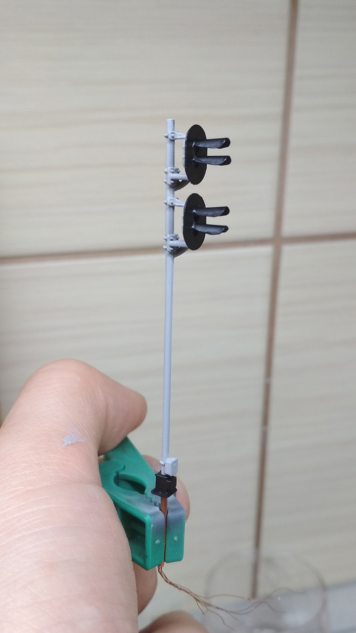 Дивлячись, як активно тут Юрій Санич макет стругає, і до мене муза прилетіла. За два вечора провів пробну збірку світлофора. Виявив косяки, в наступних будемо поправляти. Травло сьогодні малював. З сірим грунтом Motip косяк вийшов. Видно Епік його або переморозив на зберіганні, або якийсь пальоний попався. Шагрєнь, пігмент видно. Ледве задув. Зато перед тим чорний ліг ну прям ідеально, вся деталізація була видна, гладенько. Буду чорним грунтувати і треба знайти хорошу сіру фарбу. Але для бета-версії піде. Щогла вже по прототипу d140, тобто трубка 1.2 мм. Все ж таки 3д друк - вєщ. Як вручну таке робив би навіть не уявляю. Ще треба драбину. Шланг вводу грубуватий, було б добре десь ліцендрат роздобути. Або все ж скрутити три проводки 0.14 в косичку і спробувати пролити її фарбою, щоб згладити "витки".