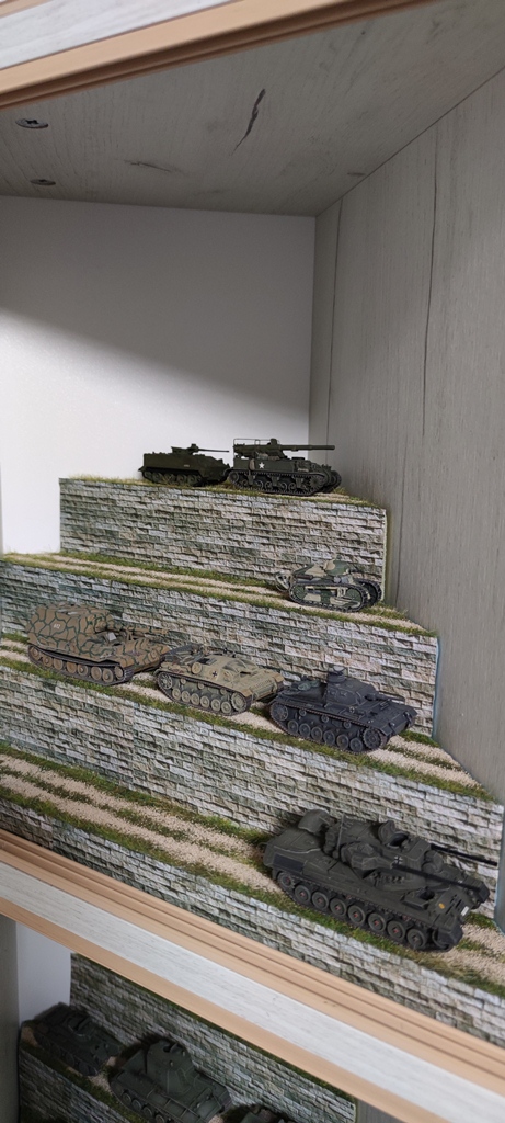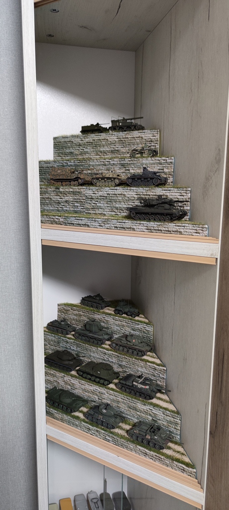 В скромных габаритах однокомнатной квартиры нашел еще одно местечко для моделизма. Сделал трапециевидную пристройку к шкафу-купе с четырьмя небольшими застекленными полочками. В дальнейшем хочу в них разместить микро-сценки. Пока продумываю тематику, быстренько сделал парочку подставок для бронетехники (или чего-то автомобильно-гужевого). Конструкция предельно простая: