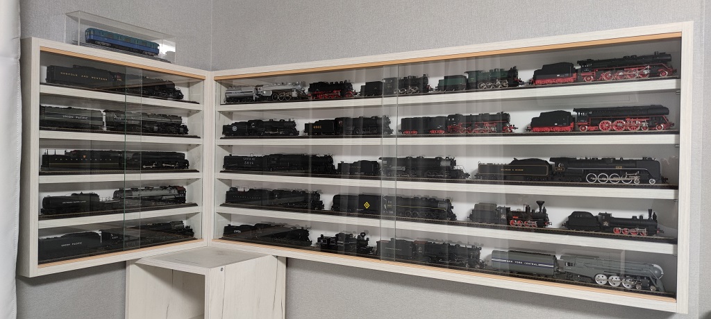 Дом постепенно восстанавливаю, но постоянно вылазят все новые и новые проблемы, которые сразу не были заметны. Поэтому живем пока в Киеве. Не столько из-за дома, сколько из-за проблем с добиранием на работу. В последнее время стало полегче, но все равно дорога в часы пик времени забирает намного больше, чем раньше. Можно считать, что нам повезло - как раз перед войной почти закончили ремонт в новой квартире дочки. Пока строили и ремонтировали квартиру, она вышла замуж, живет у мужа. Ну а мы с женой временно поселились в ее квартире. На днях закончил ремонт и изготовление мебели. Ну, конечно, я не мог не выделить и себе немного места под хобби. Вот что в результате получилось: столик с тумбочкой и небольшая витрина. На ней даже все паровозы не поместились... Все равно лучше, чем ничего. Остальное все будет в Ворзеле.