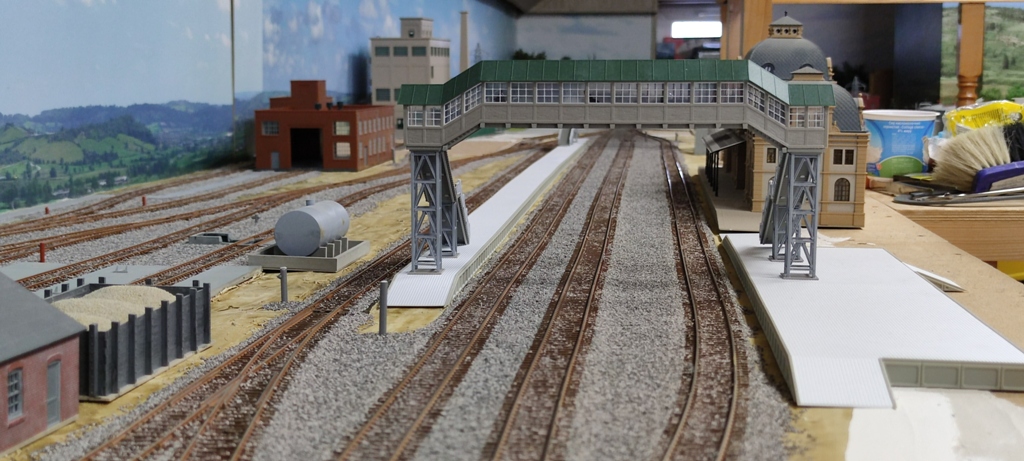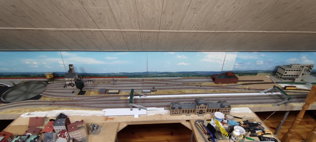 Наряду с наведением порядка на чердаке наконец-то вплотную занялся и самим макетом. В основном сделал самую муторную, как по мне, работу - забалластировал пути в депо и на станции. В основном - потому что балласт закончился. Поэтому и вид еще далеко не законченный. Красить буду позже после полного окончания засыпки и выравнивания. А пока поставил собранные строения и сооружения для понимания общего впечатления. Вот что получается...