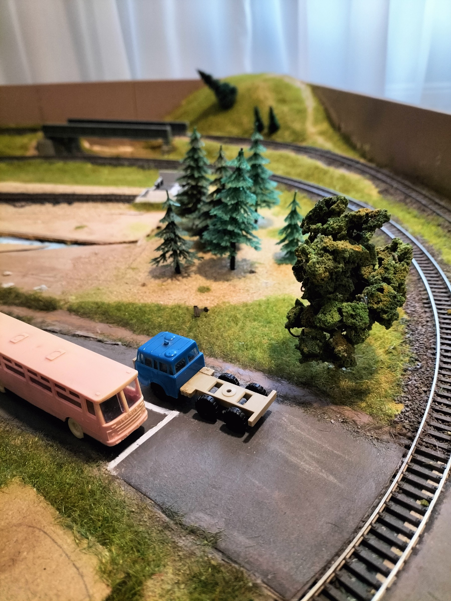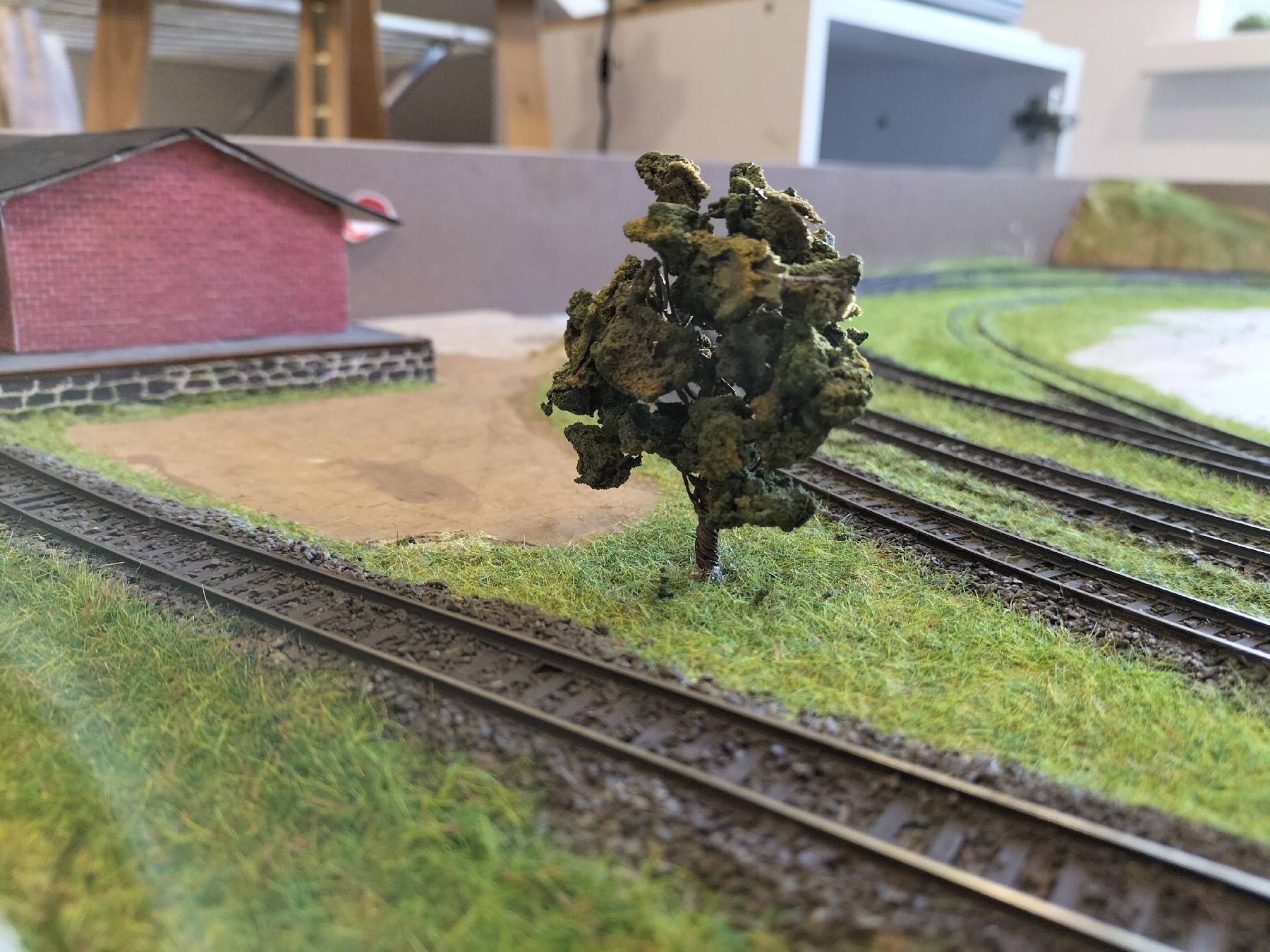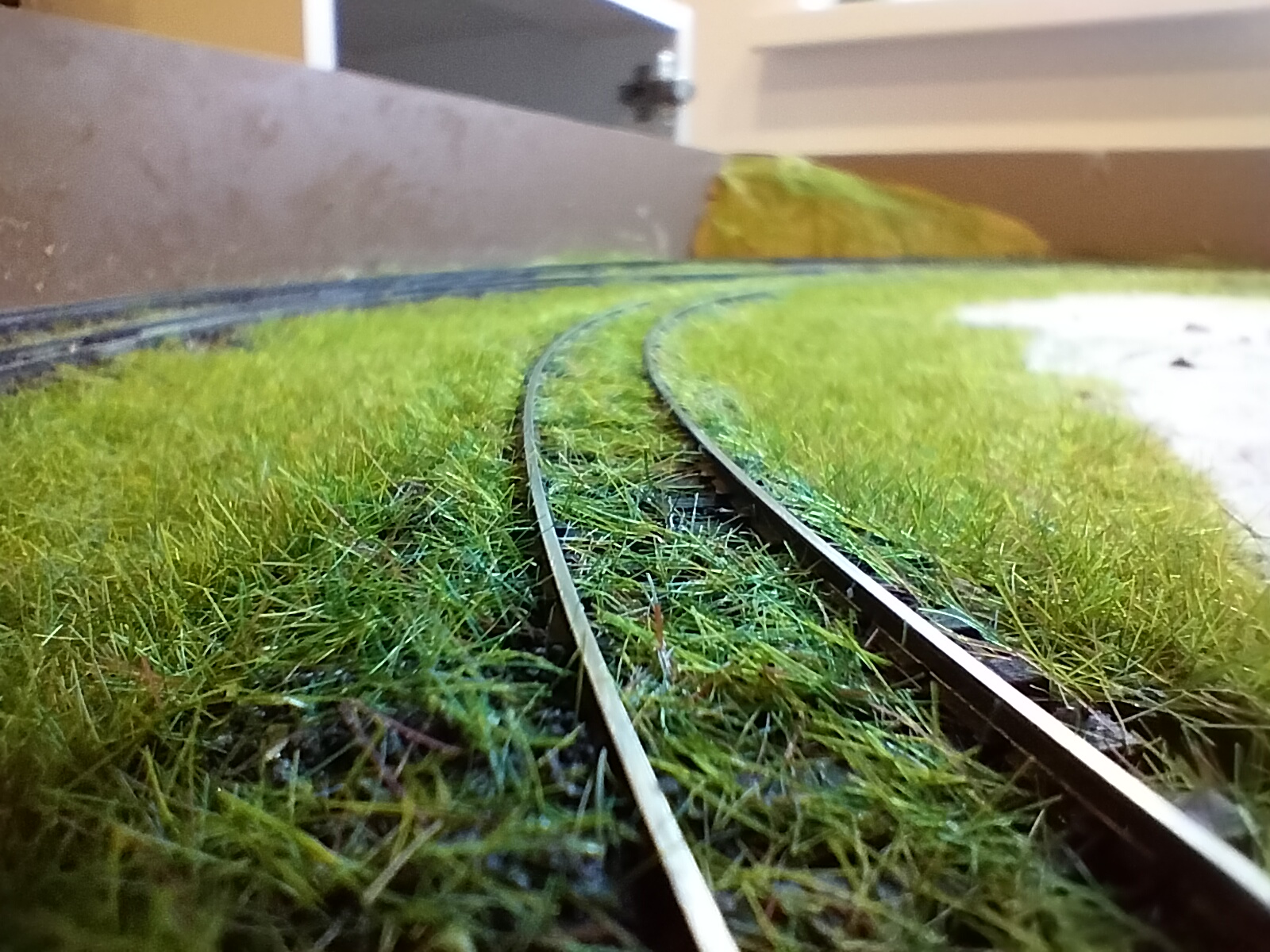 По траві - вона в принципі стирчить, але стирчить в різні сторони, її би причесати чимось. Між коліями вийшло не дуже - я сипав там дрібну у 2-3мм, а воно змішалося в кашу з клеєм. А ялиночки Vero це класика, ялиночок ще треба в треба буде.