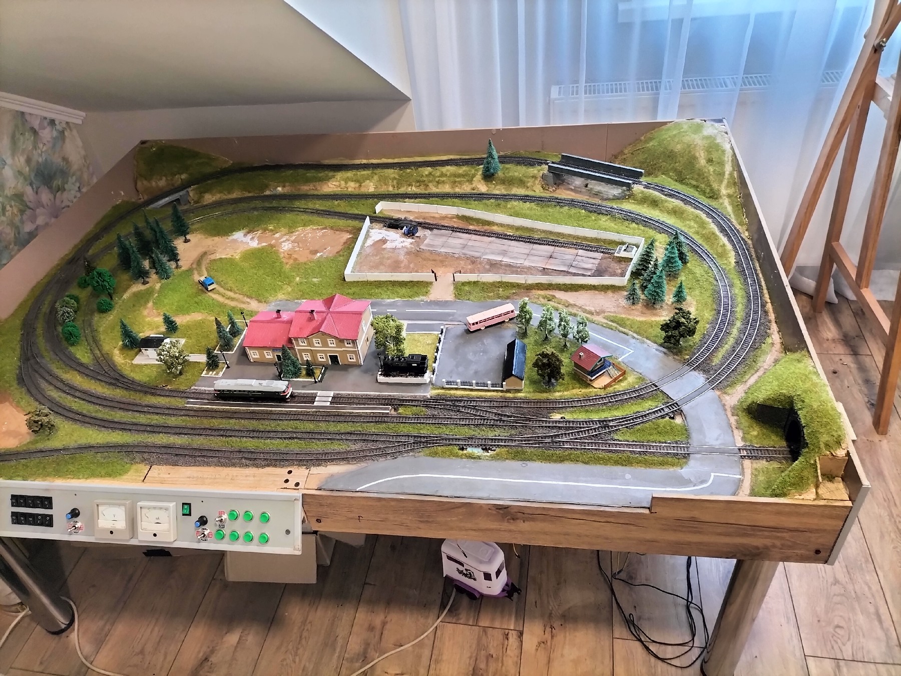 Чергове проміжне підбиття підсумків. Макет нарешті "став на ноги", що дозволило легко його пересувати та працювати з проводкою знизу без перевертання його на бік, останнє до речі вже досить важко зробити без сторонньої допомоги - макет набирає масу. Усього 5 ніжок для столу, одна по центру до більшої стійкості та попередження прогину макету під власною вагою. Зайнявся трохи архітектурою та освітленням, а також відсотків на 90 пофлокував. Після заміни батарейки справа флокування пішла веселіше. Освітлення - вокзальні ліхтарі - "Вісман", в будинках світлодіоди.