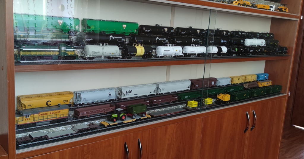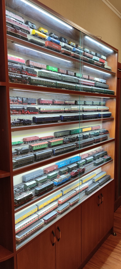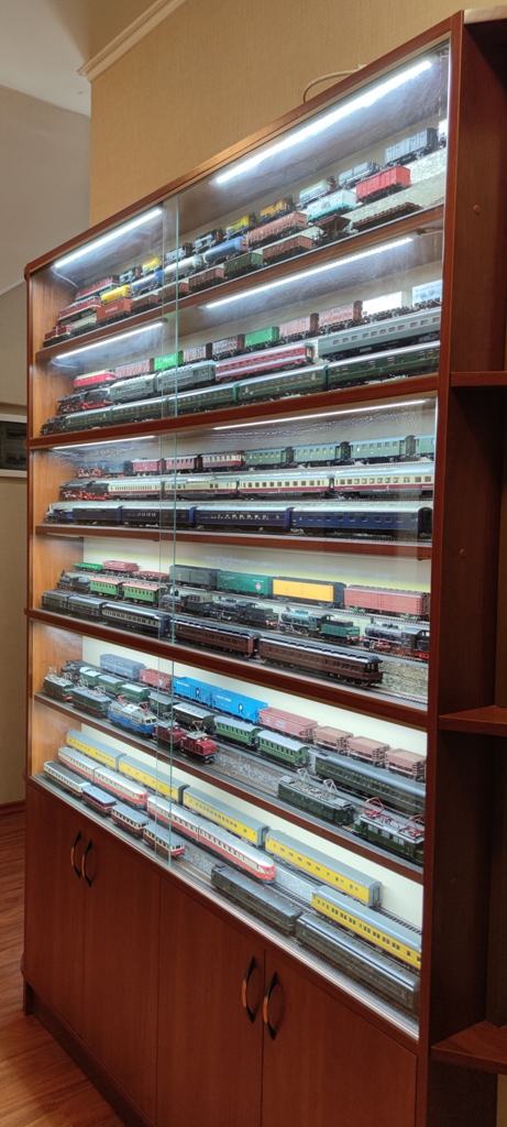 На этих выходных закончил восстановление выставки. Правда, подсветку сделал только в одном шкафу. Делал я ее еще до войны, во втором шкафу просто не успел. Шкафы находятся в коридоре, фотографировать пришлось телефоном с близкого расстояния. Поэтому на фотографиях геометрические искажения и не совсем удачные ракурсы. Второй шкаф находится напротив окна, поэтому чтобы минимизировать отражение окна в стеклах пришлось снимать сбоку.