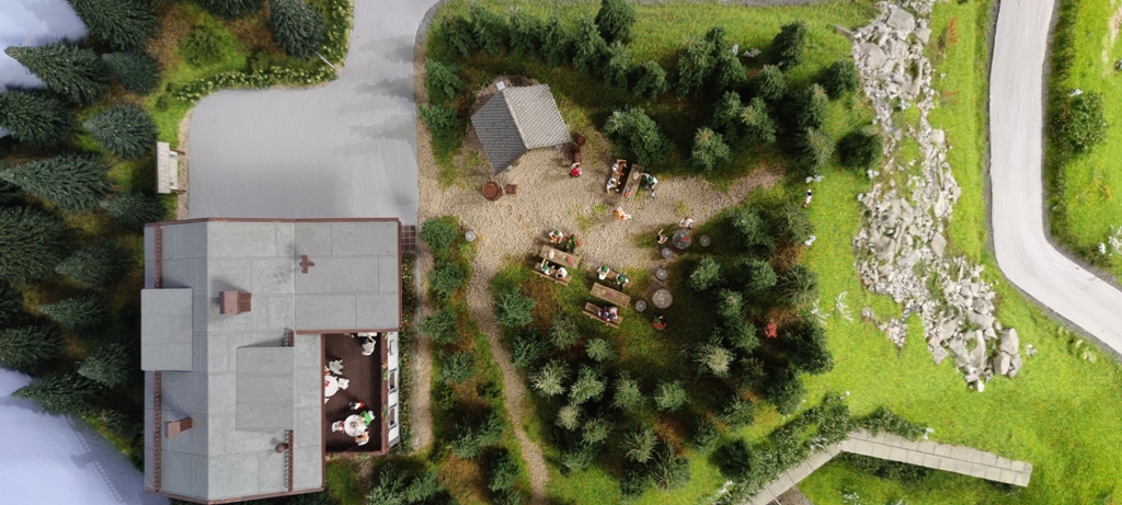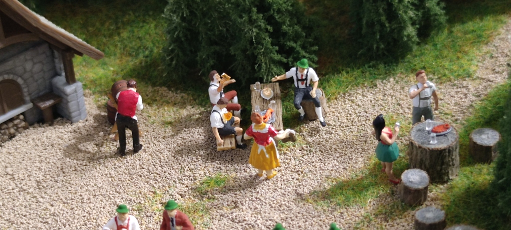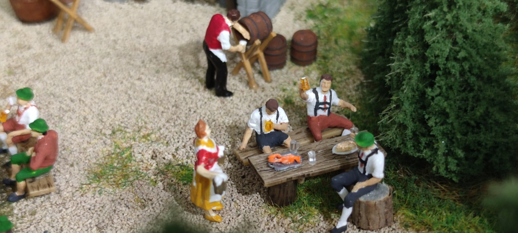 Но ничего, есть чем другим заняться по макету. Давно лежал у меня набор фигурок Preiser 16356 Im Biergarten. Наконец-то собрался, склеил и покрасил фигурки, добавил к ним несколько уже готовых фигурок Preiser, столики, скамейки, пеньки, бочки, кружки, бутылки, закуску. И вот что получилось: