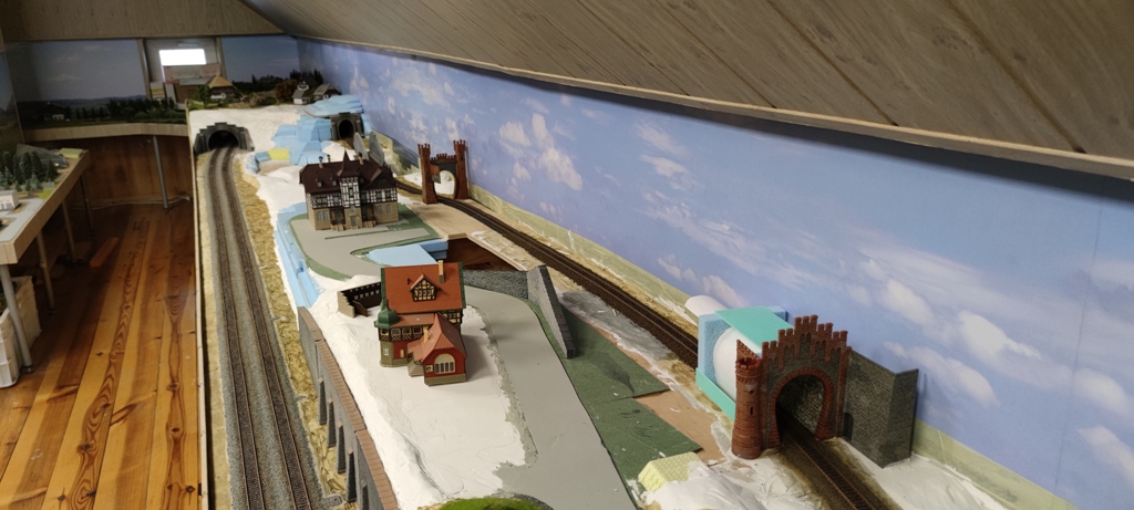 Начал заливку воды и озеленение берегов и скал. Пока вода сохнет (что-то уж очень долгий процесс...) показываю рельсовую схему макета. Хотел это сделать еще перед войной после проведенной инвентаризации, но не сложилось. Схему рисовал в WinTrack, но исключительно как концепцию построения макета. Конкретно по месту все уточнялось. Например, очень долго определялся со схемой станции в Старом городе. Проблема была в том, что под станцией проходит двухпутный туннель. Нужно было так расположить стрелки, чтобы подмакетные привода стрелок не попали в габарит приближения путей на нижнем уровне. Поэтому схема станции получилась несколько "кривоватая" как на мой взгляд...