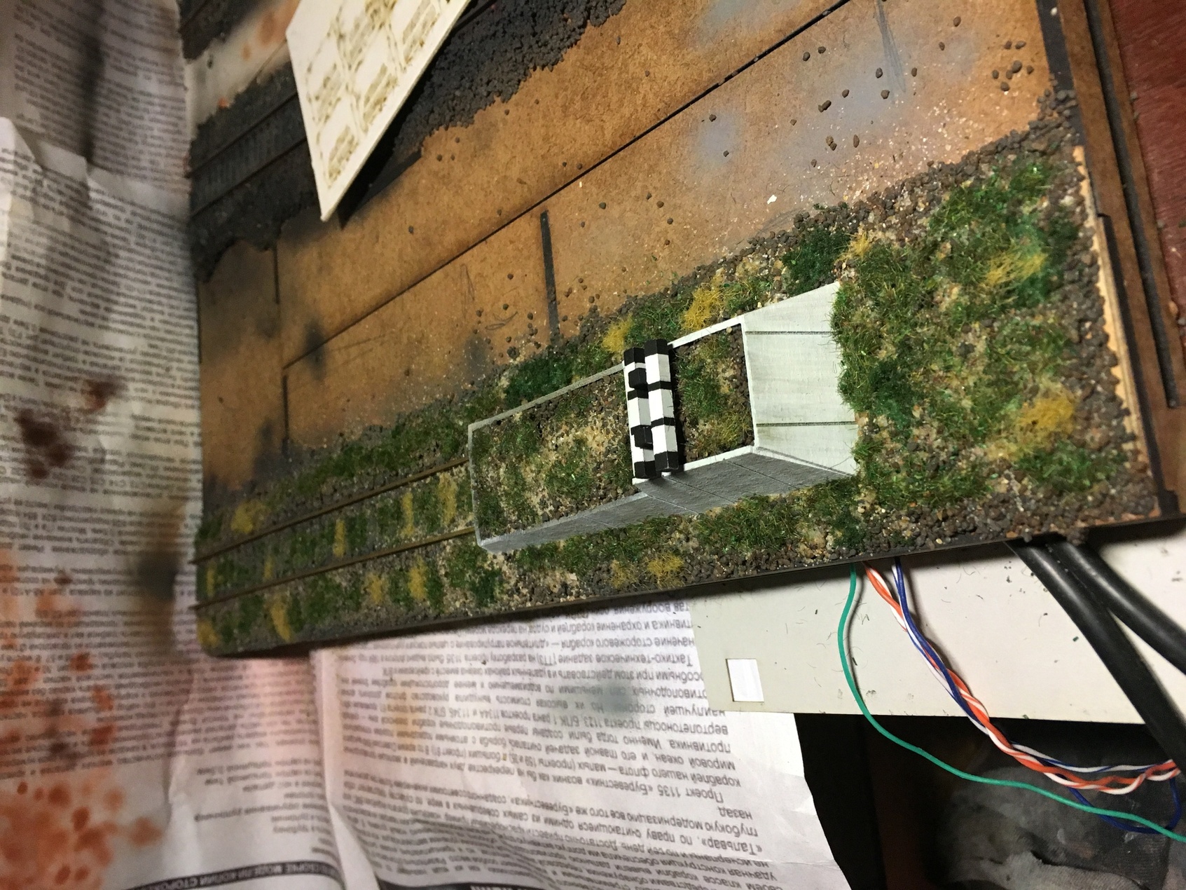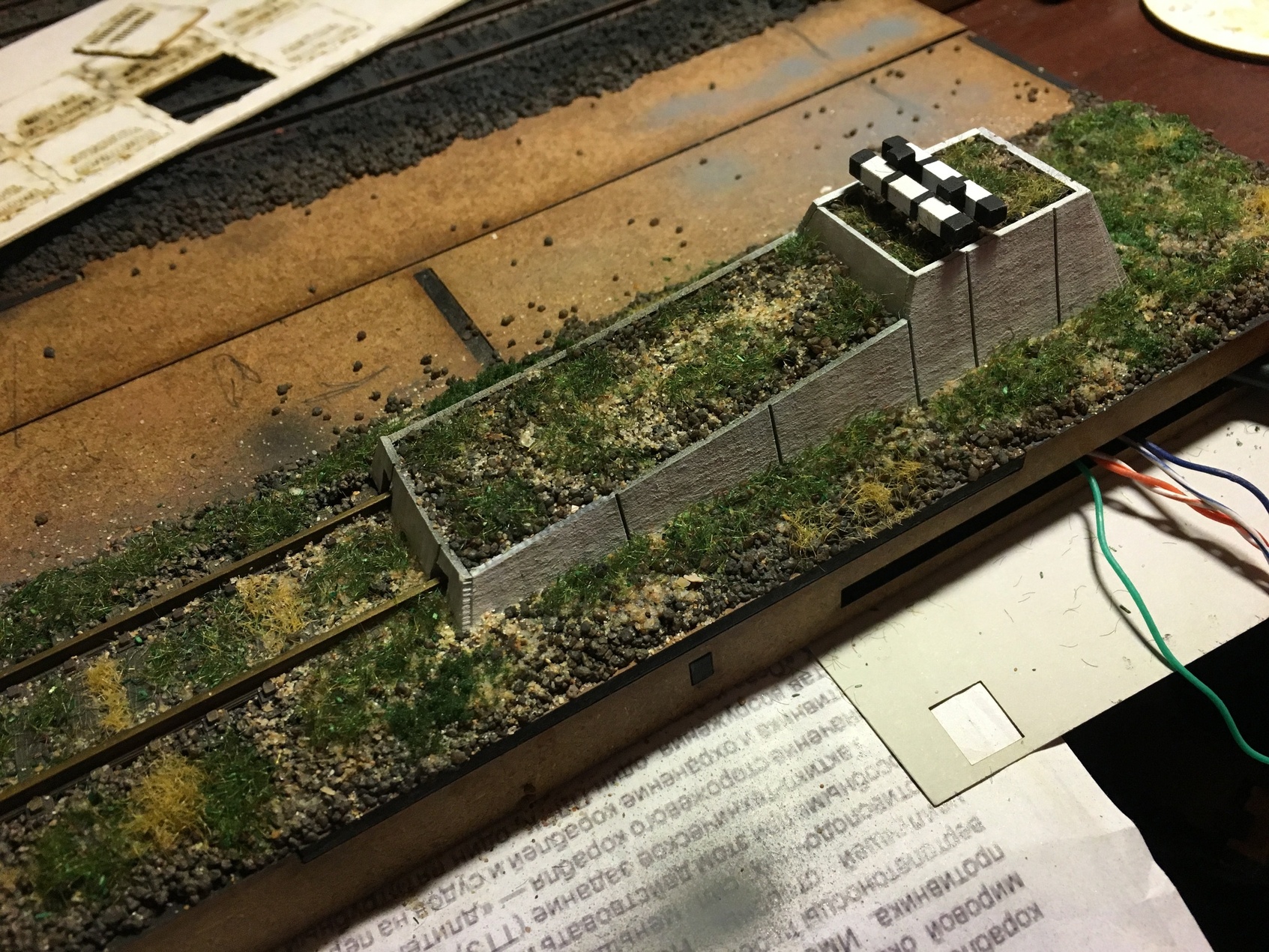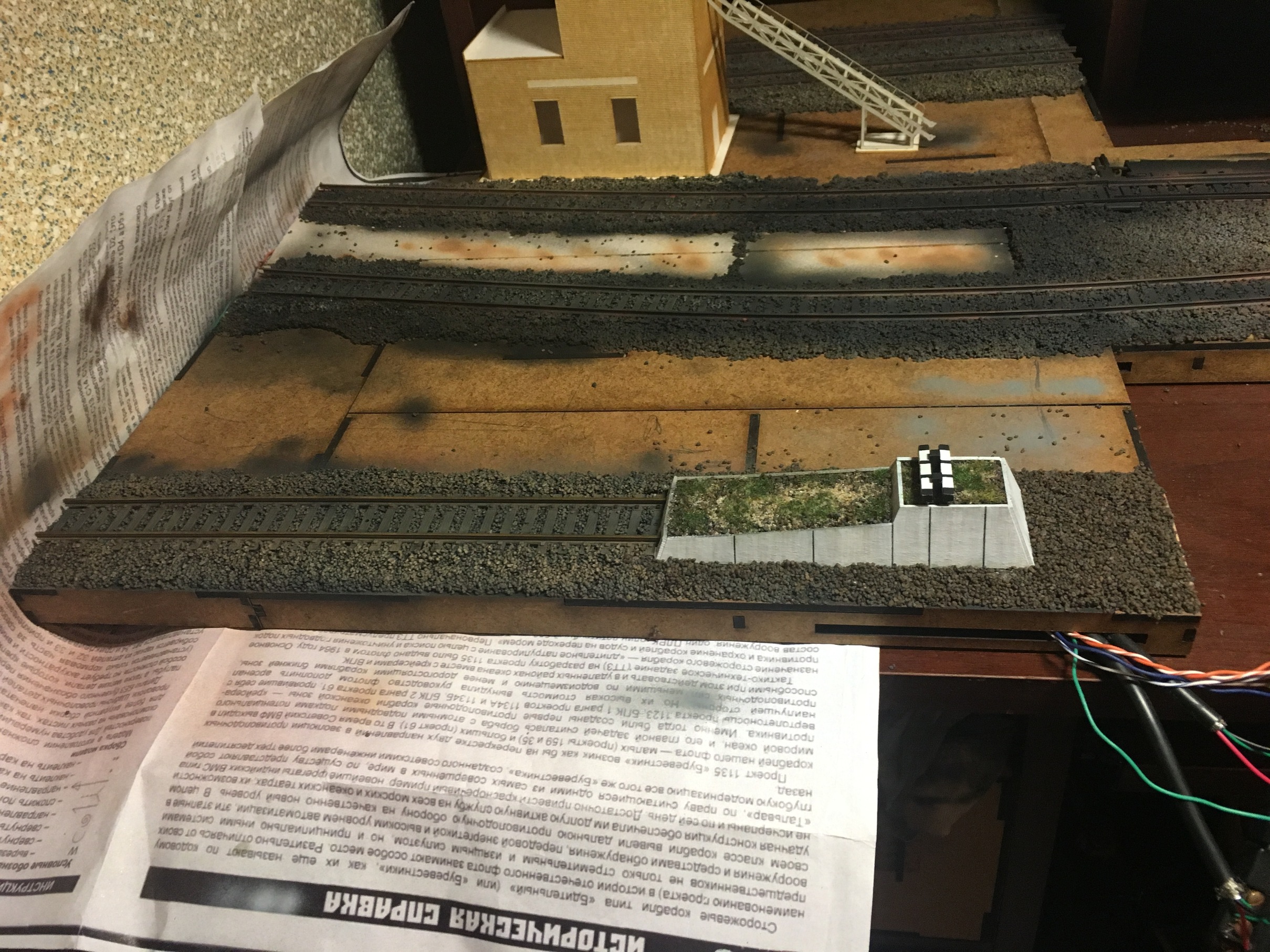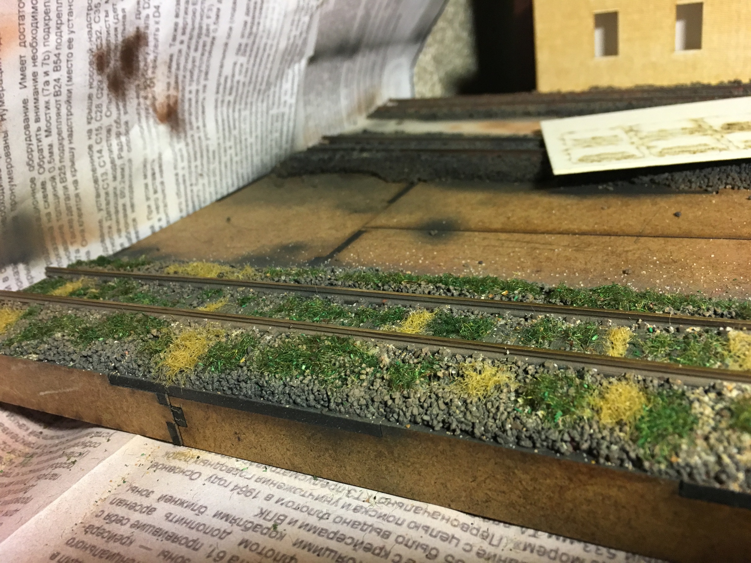 Здравствуйте уважаемые. На счёт щебня и прочего. Я не хотел связываться с затирками типа шпатлёвки и гипса. На фото выше, примерно показано, что я хочу. Но там обычные пути. Я позже выложу фото, непосредственно с ПТОЛ станции Дмитров. Откуда само здание ПТОЛ. Там точно так же щебень везде. С одной стороны песок, так как там здание песочницы, с другой щебень и совсем немного земли. Точнее, её почти нет. Даже тропинка и та по щебню, с совсем легким налётом земли. Я понимаю прекрасно, что имели в виду. Полное отсутствие щебня, всё ушатанное, в земле, налёте масла и остатков прочего и местами травы немного. Но причина, по которой я от этого отказался, в начале сообщения. На фото ниже, результат по тупику. У самого ПТОЛ и заправки, будет примерно так же, только изменятся пропорции песка и растительности. И кое-где, пройдусь специальной затиркой для декора. На нескольких фото ниже, показал эффект этой затирки. Просто сухой кистью иначей пройдусь и потом смывками. Это несколько зданий в 1/60, для настольных игр.